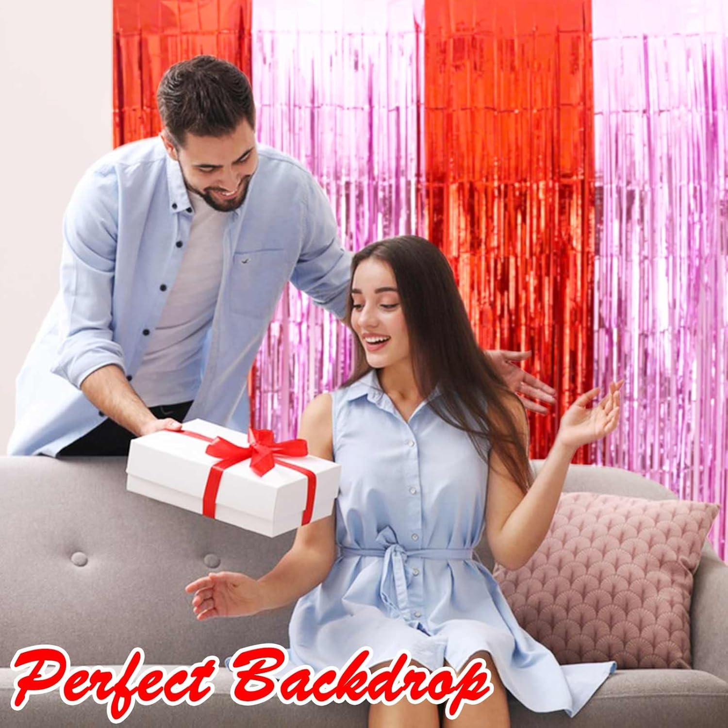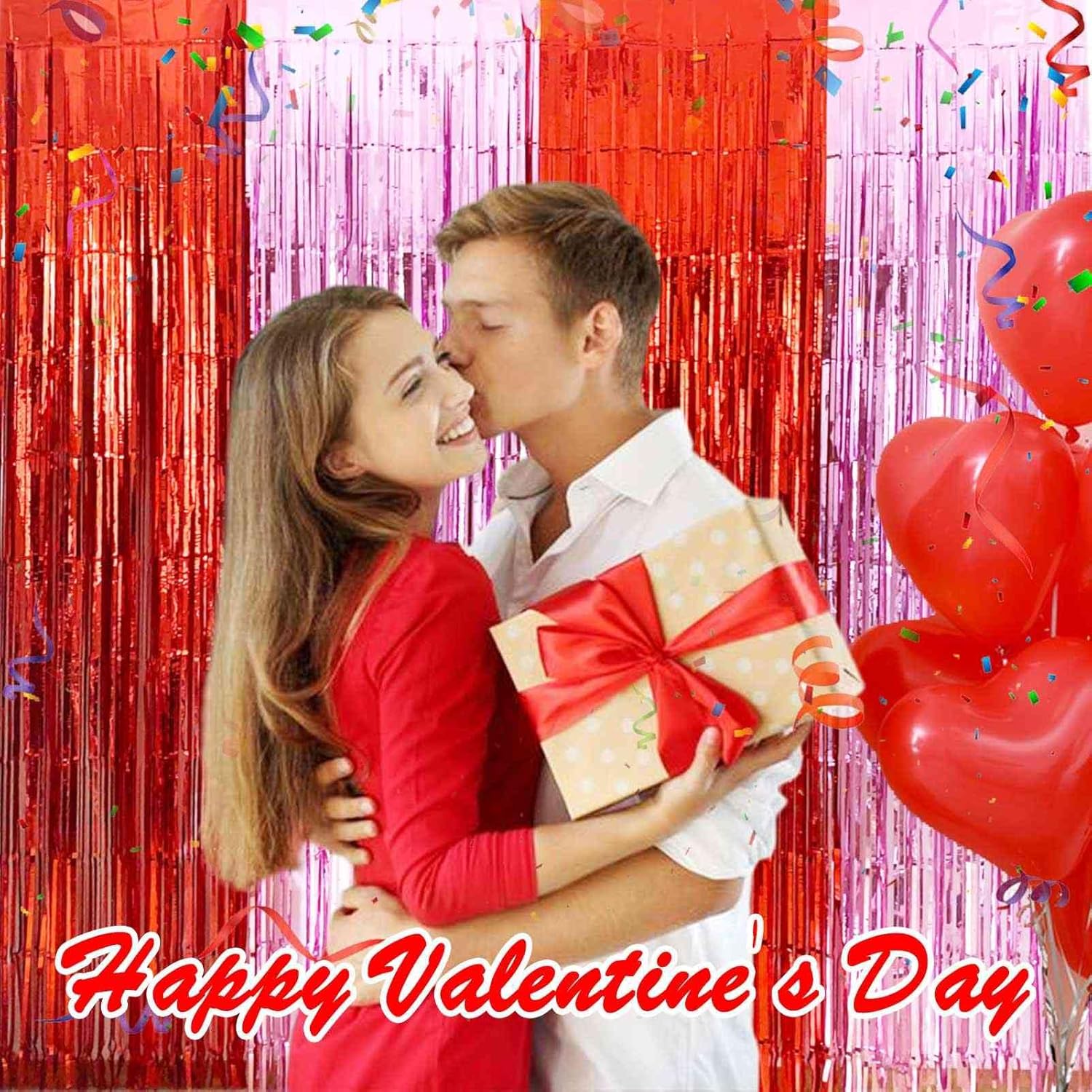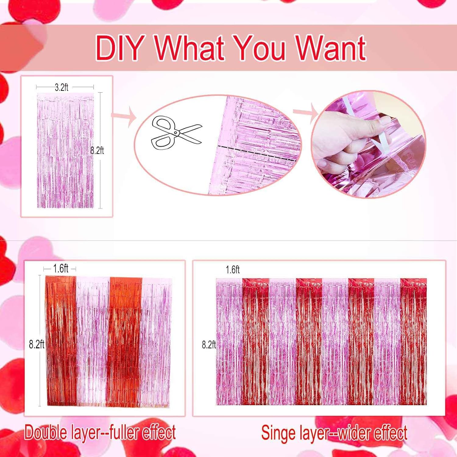 • RED PINK METALLIC TINSEL FOIL FRINGE CURTAINS: The package includes 4packs foil fringe backdrop curtains(2pack red +2pack pink), each metallic tinsel curtain is 3.2ft(wide)×8.2ft(drop), wonderful accessories for decorating doorway, window and walls. This stunning foil fringe curtain has a metallic finish that will add a touch of glamour to Valentine's Day party backdrop