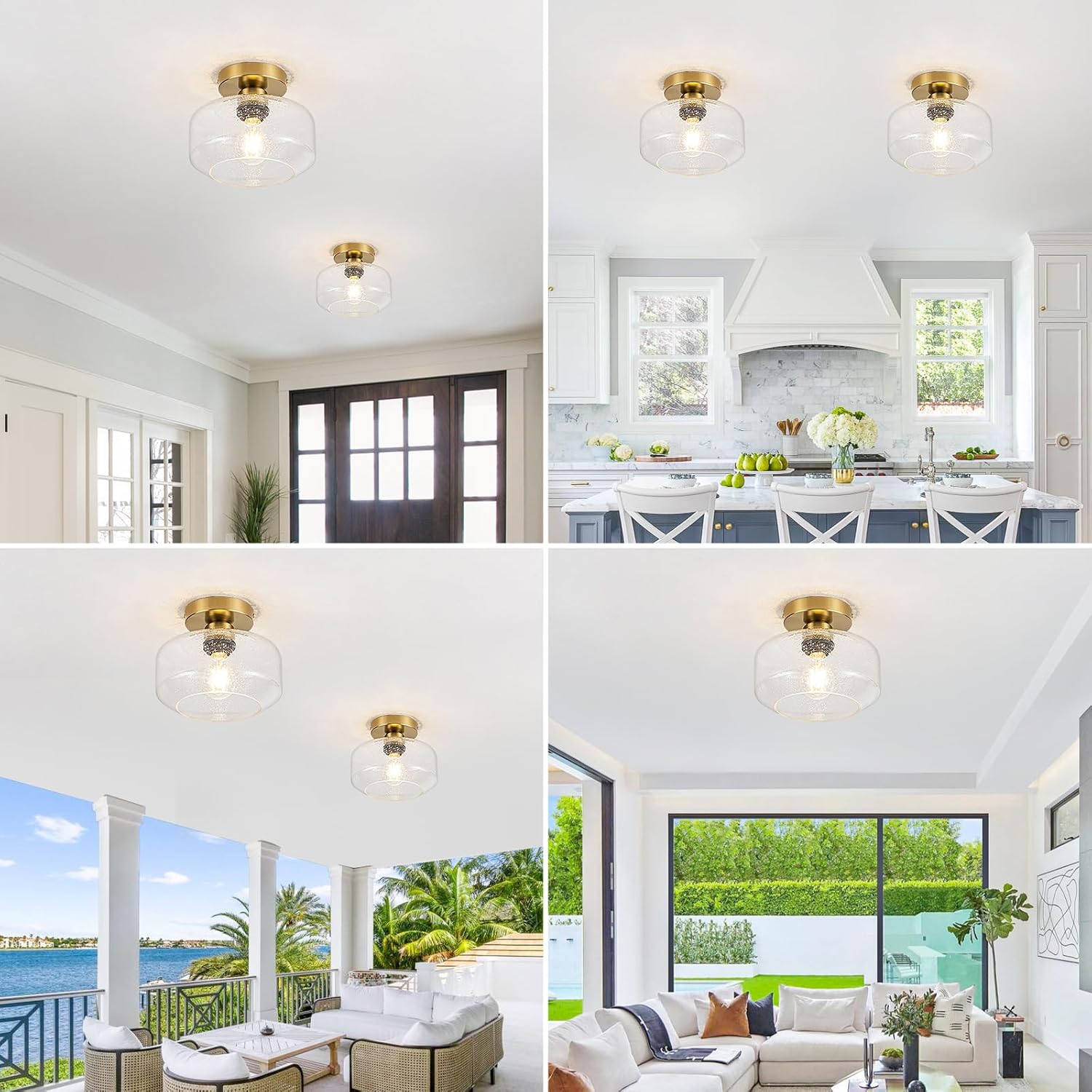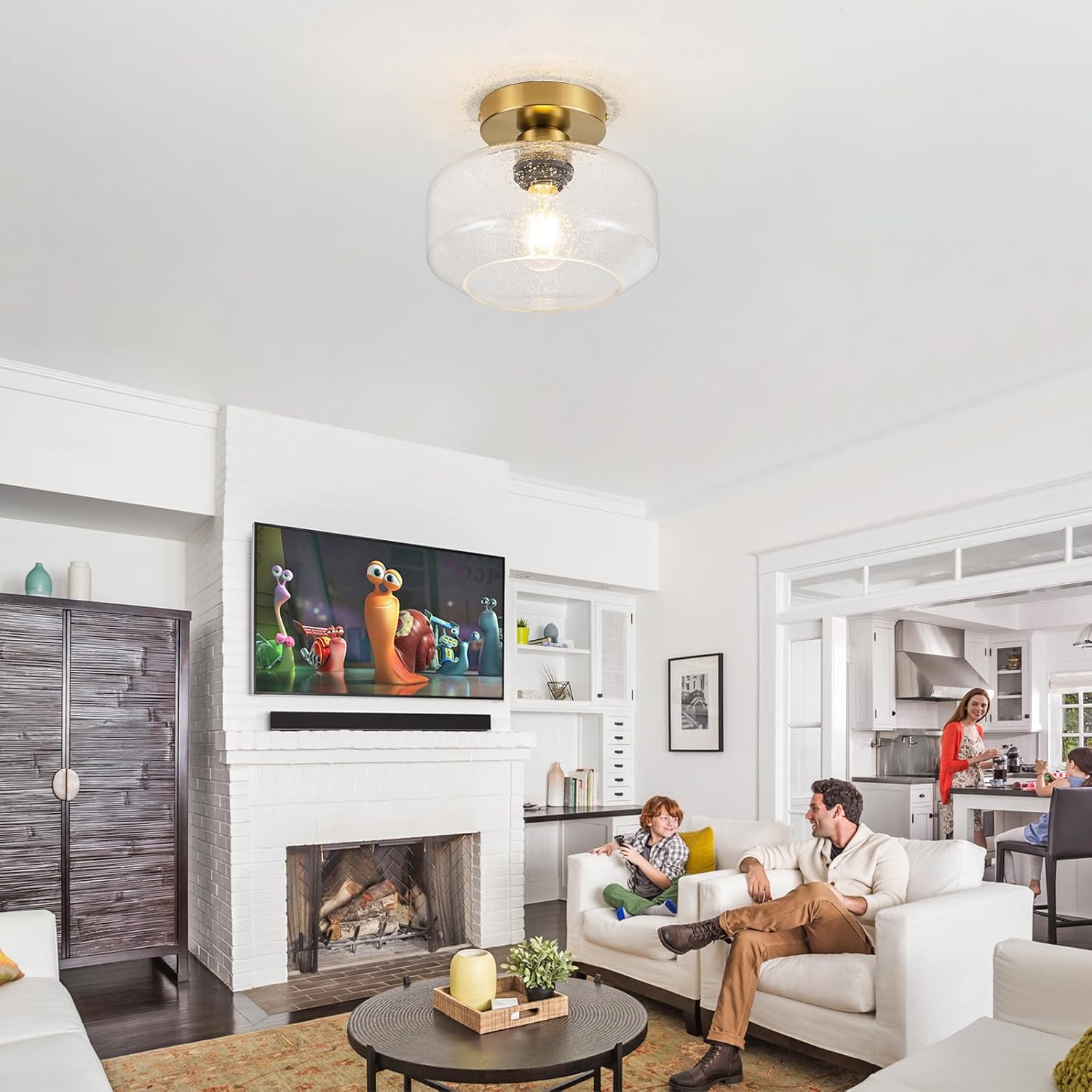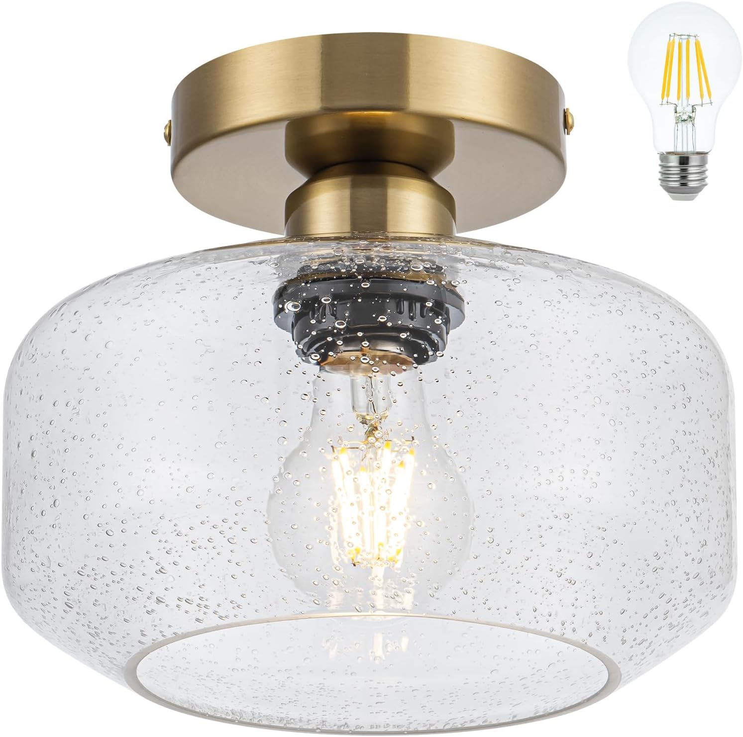 Simple & Elegant Semi Flush Mount Ceiling Light - Gold and Brass Fixture w/ 900LM LED Bulb for Kitchen, Bathroom, Hallway Lighting | Vintage Seeded Glass | Easy Install