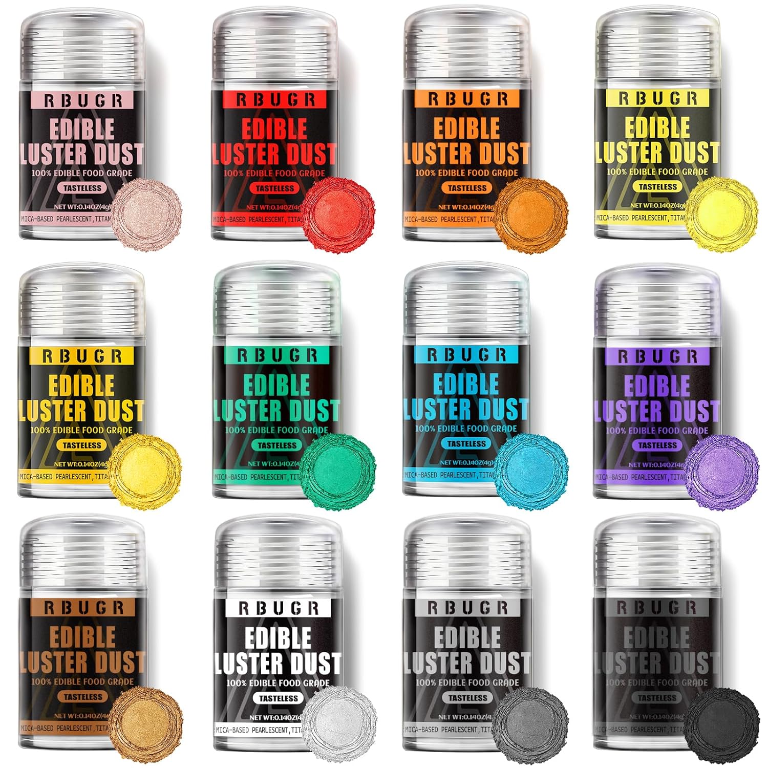 RBUGR Luster Dust Edible, 12 Colors Edible Glitter Pack, Cocktail Food Glitter Edible Dust, Vegan Edible Shimmer, Drink Powder for Cakes Cookies Chocolates Baking(4g/0.14oz)