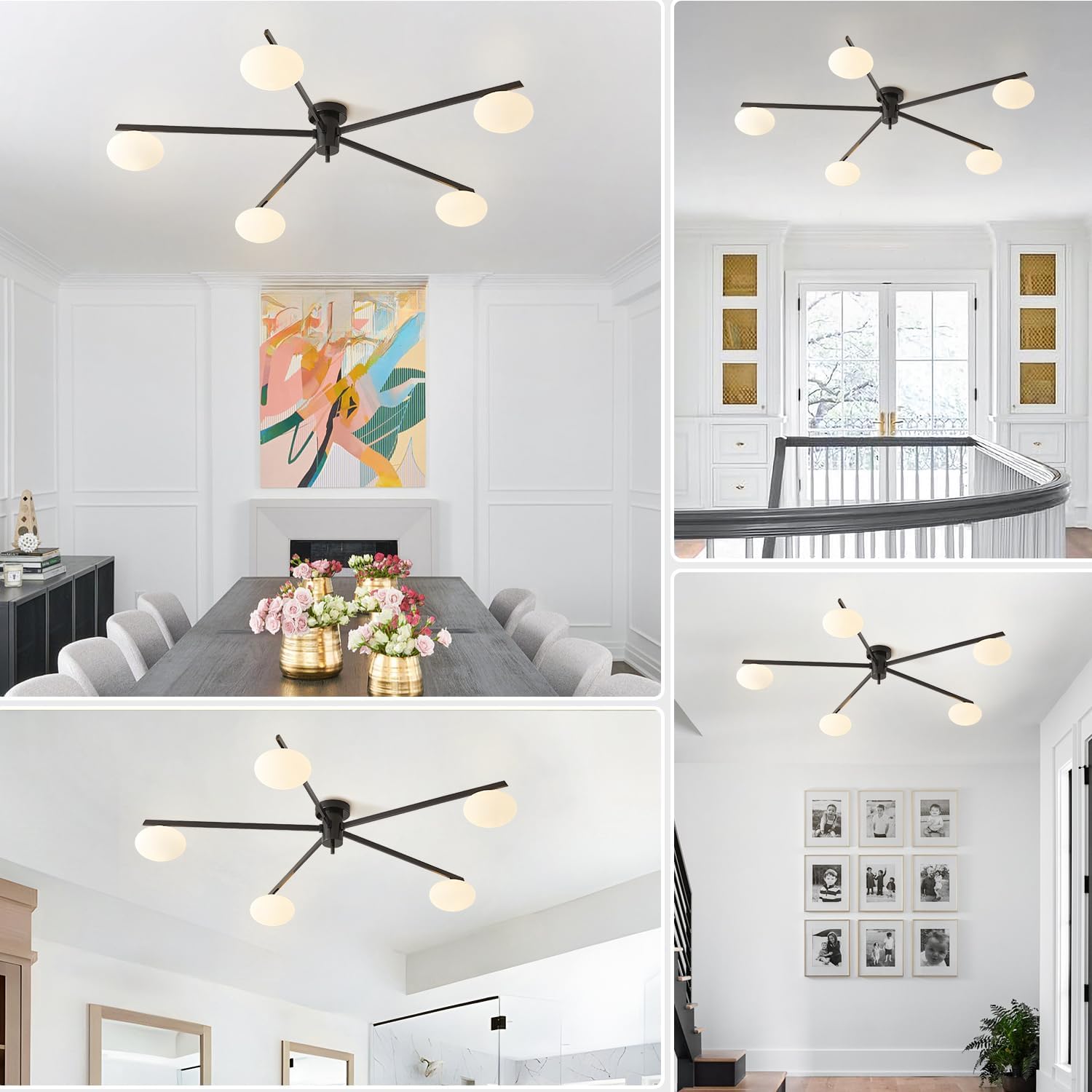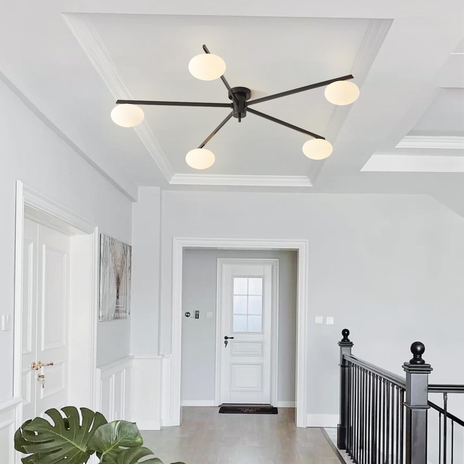 5 Lights Mid Century Modern Black Sputnik Semi Flush Mount Ceiling Light Vintage Glass Close to Ceiling Light Fixtures Industrial Metal Ceiling Chandelier Glass Globe Hall Light MCL05-BK