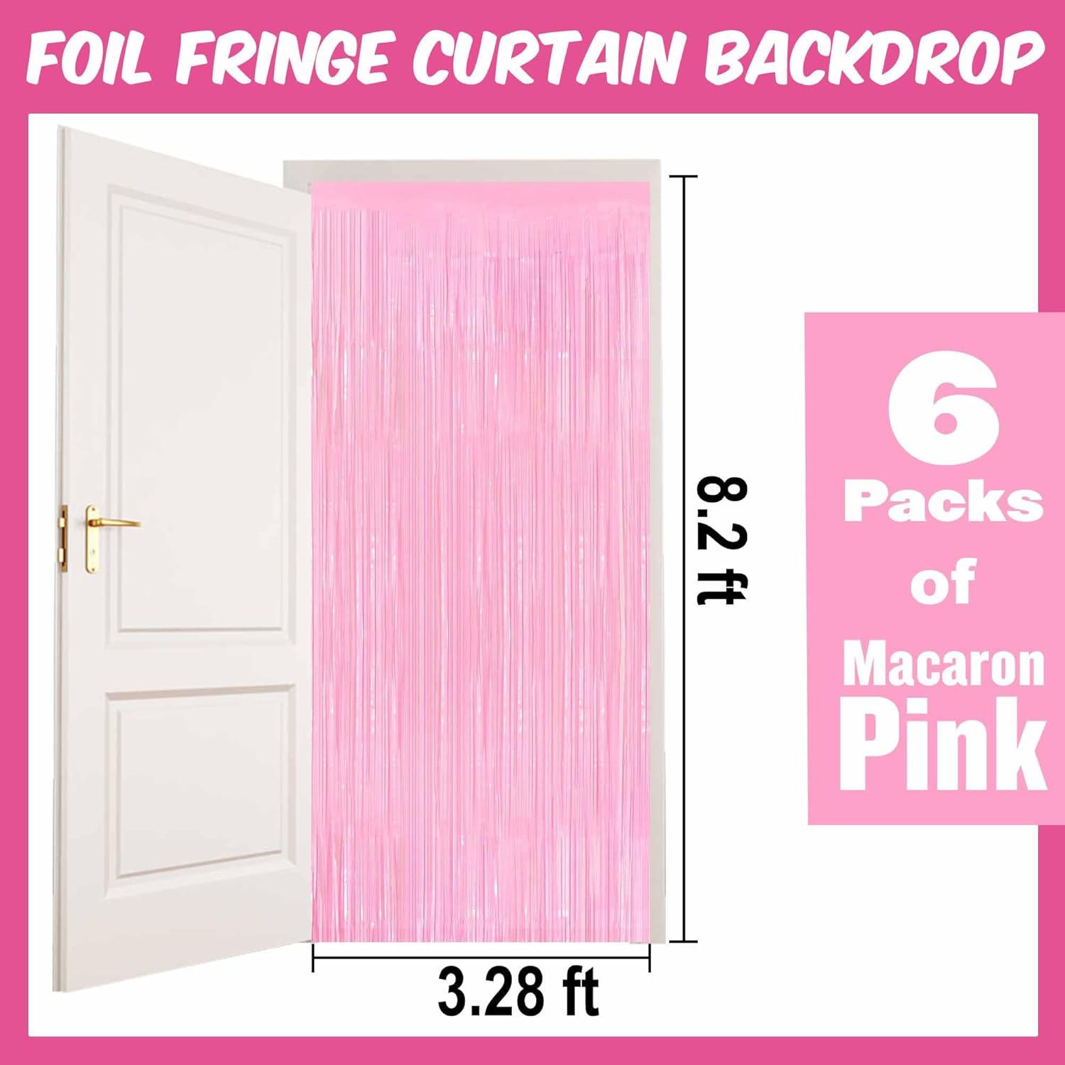 6 Pack Macaron Pink Foil Fringe Curtains Backdrop, 3.28 x 8.2 Ft Metallic Streamers Tinsel Curtains Background for Photo Booth, Birthday, Weddings, Carnivals, Graduation, Themed Party Decorations