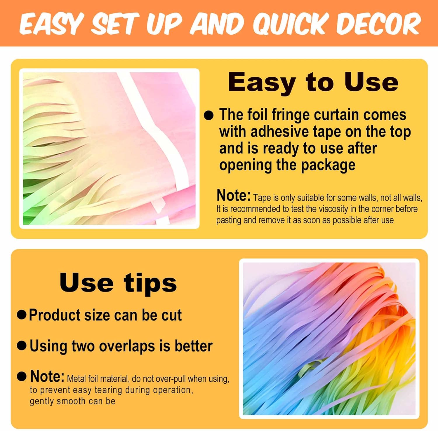 • Easy to Use: The tinsel foil fringe streamers curtain backdrop comes with double sided tape on the top, gently peel plastic strip off and it would be very easy to paste on smooth surfaces such as wall, window, table, door or anywhere you like
