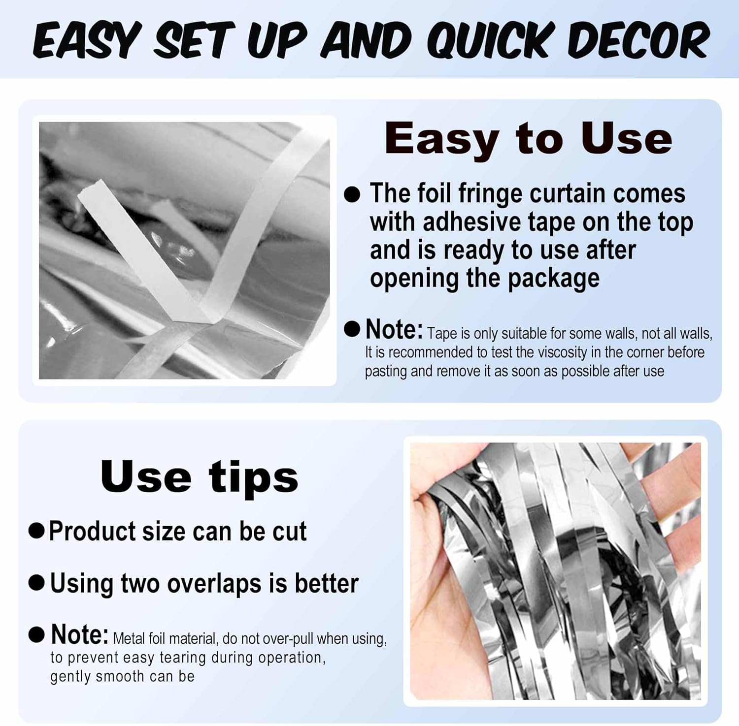 • Easy to Use: The tinsel foil fringe streamers curtain backdrop comes with double sided tape on the top, gently peel plastic strip off and it would be very easy to paste on smooth surfaces such as wall, window, table, door or anywhere you like