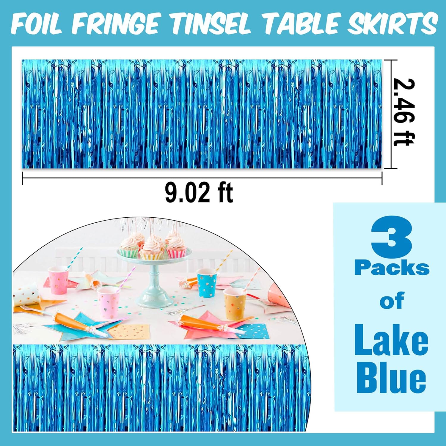 3 Pack Lake Blue Foil Fringe Table Skirts Metallic Tinsel Streamers Garland Banner Backdrop for Table Decor, Parade Float, Birthday, Wedding, Halloween, Christmas Party Decorations(29x108 In)