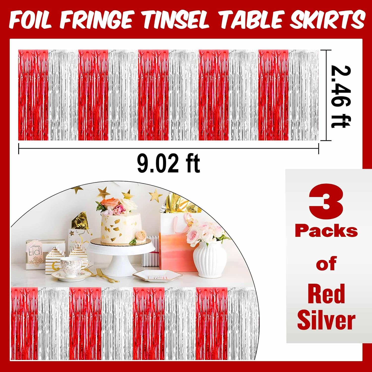 3 Pack Red and Silver Foil Fringe Table Skirts Metallic Tinsel Streamers Garland Banner Backdrop for Table Decor, Parade Float, Birthday, Wedding, Halloween, Christmas Party Decorations(29x108 In)