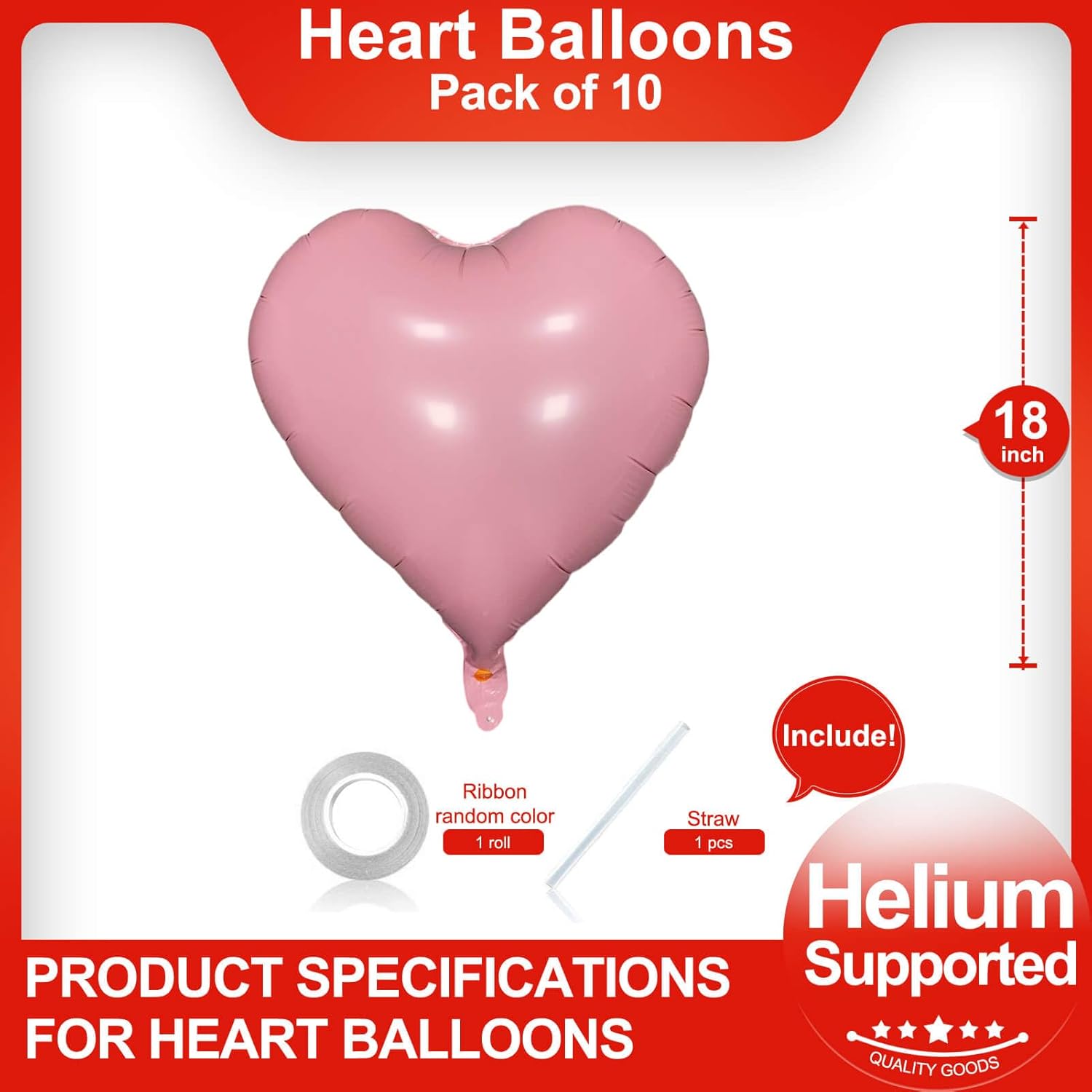 • Package Included:10Pcs 18 inch Pastel Pink Heart Shaped Balloons (uninflated) + 1pcs Straw +1pcs 32 foot Ribbon Roll