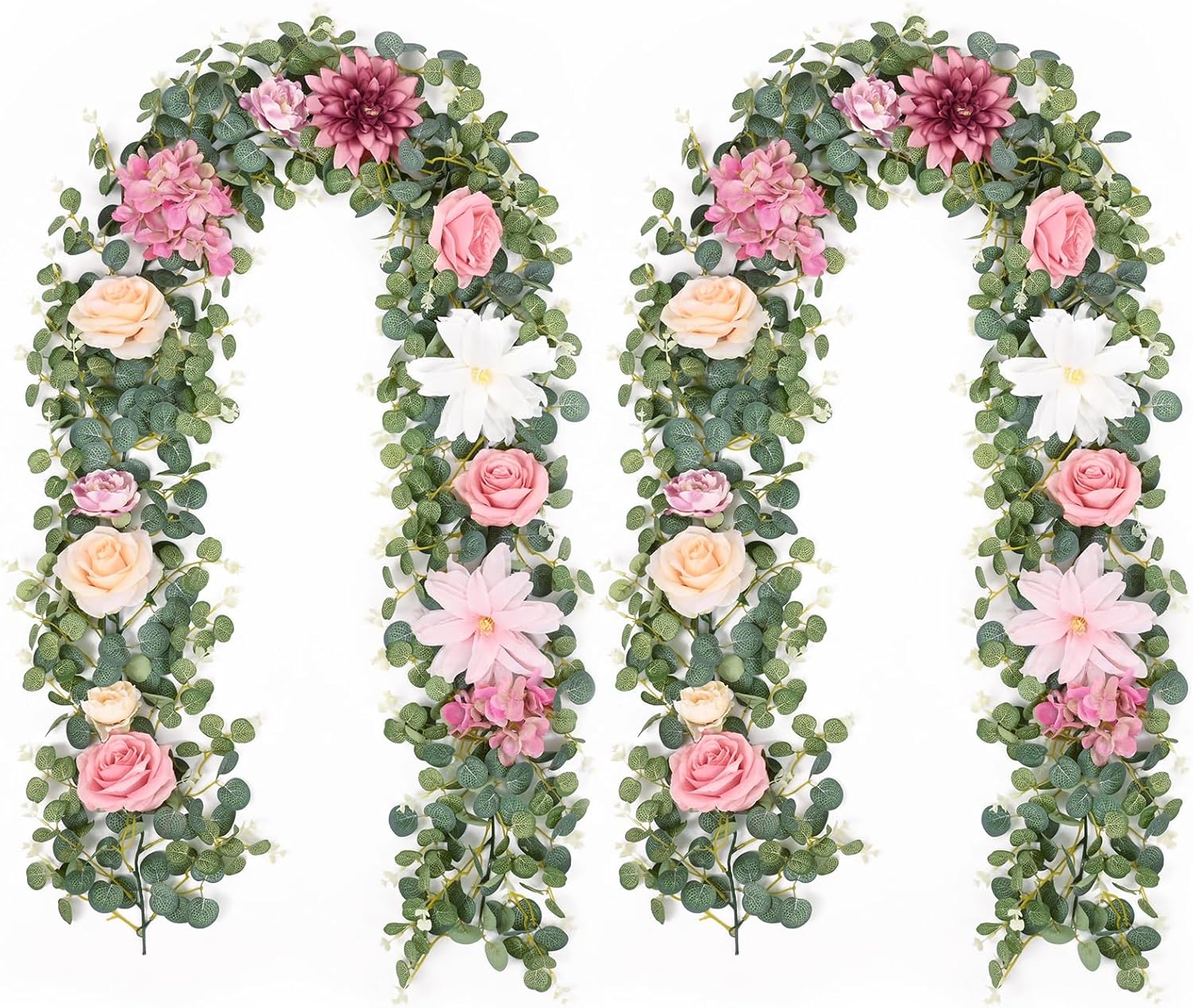 • 💗ABUNDANT FLORAL MATCH: Indulge in the enchanting variety of our eucalyptus garland with flowers. We've handpicked romantic roses, sumptuous peonies, delicate hydrangeas and majestic dahlias to intersperse among the eucalyptus foliage. Create a different full layering and sense of romantic.