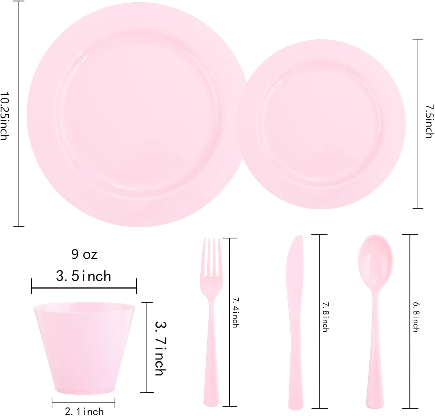 • WELL-PACKED: 150 pack includes 25 10.25" pink dinner plates25 7.5" salad plates, 25 forks , 25 knives,25 spoons,25 cups .We use durable and pretty packaging to guarantee that your Pink Dinnerware Set arrive in the best condition possible.It’s also convenient to have a outdoor picnic