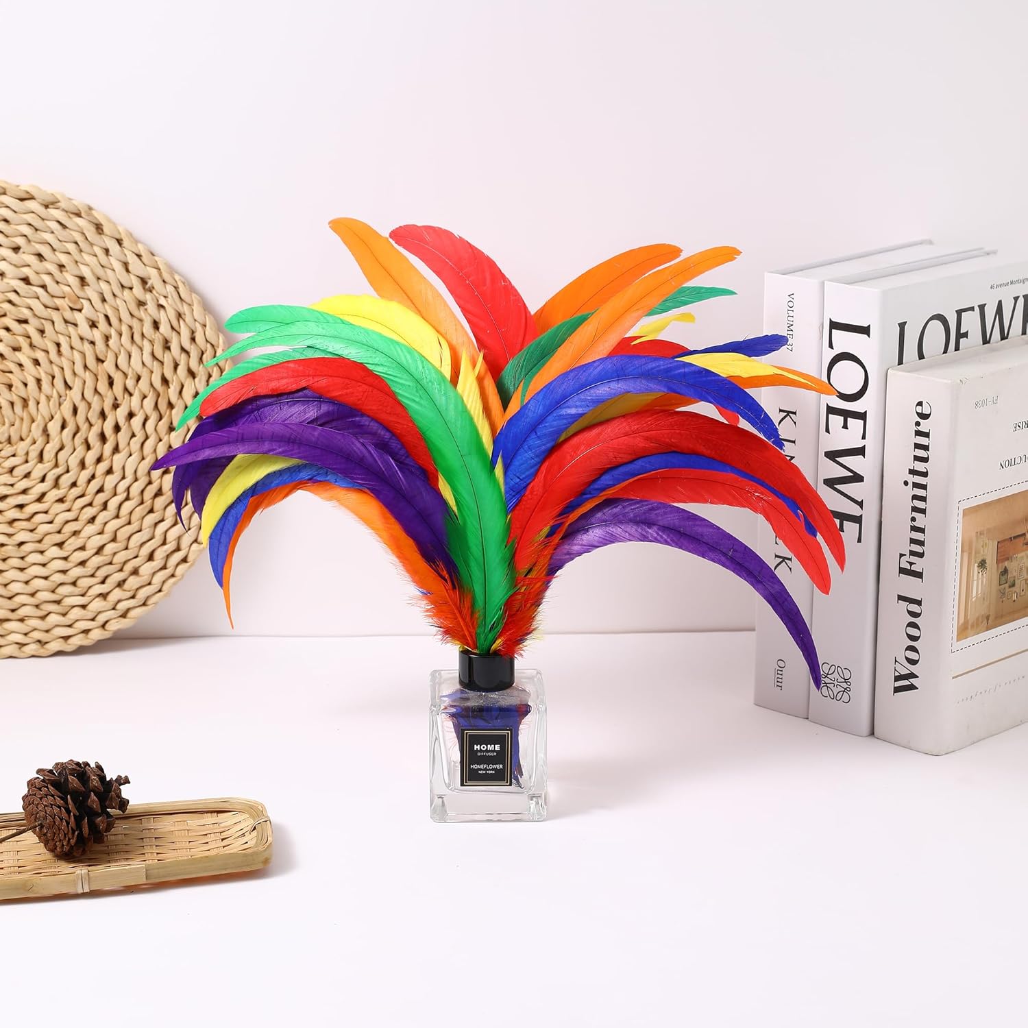 • 60Pcs Rooster Tail Feathers: A pack of 60pcs colorful rooster tail feathers in an envelope. A rich quantity that cannot be missed