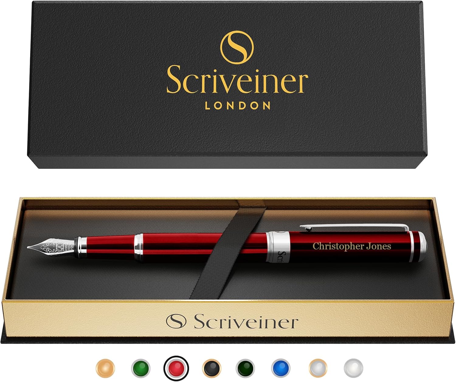 Scriveiner Personalized Deep Crimson Red Pen - Stunning Red Lacquer Luxury Pen with Chrome FinishGerman Schmidt Nib (Medium), Best Engraved Fountain Pen Gift Set for Men & Women, Name Engraving