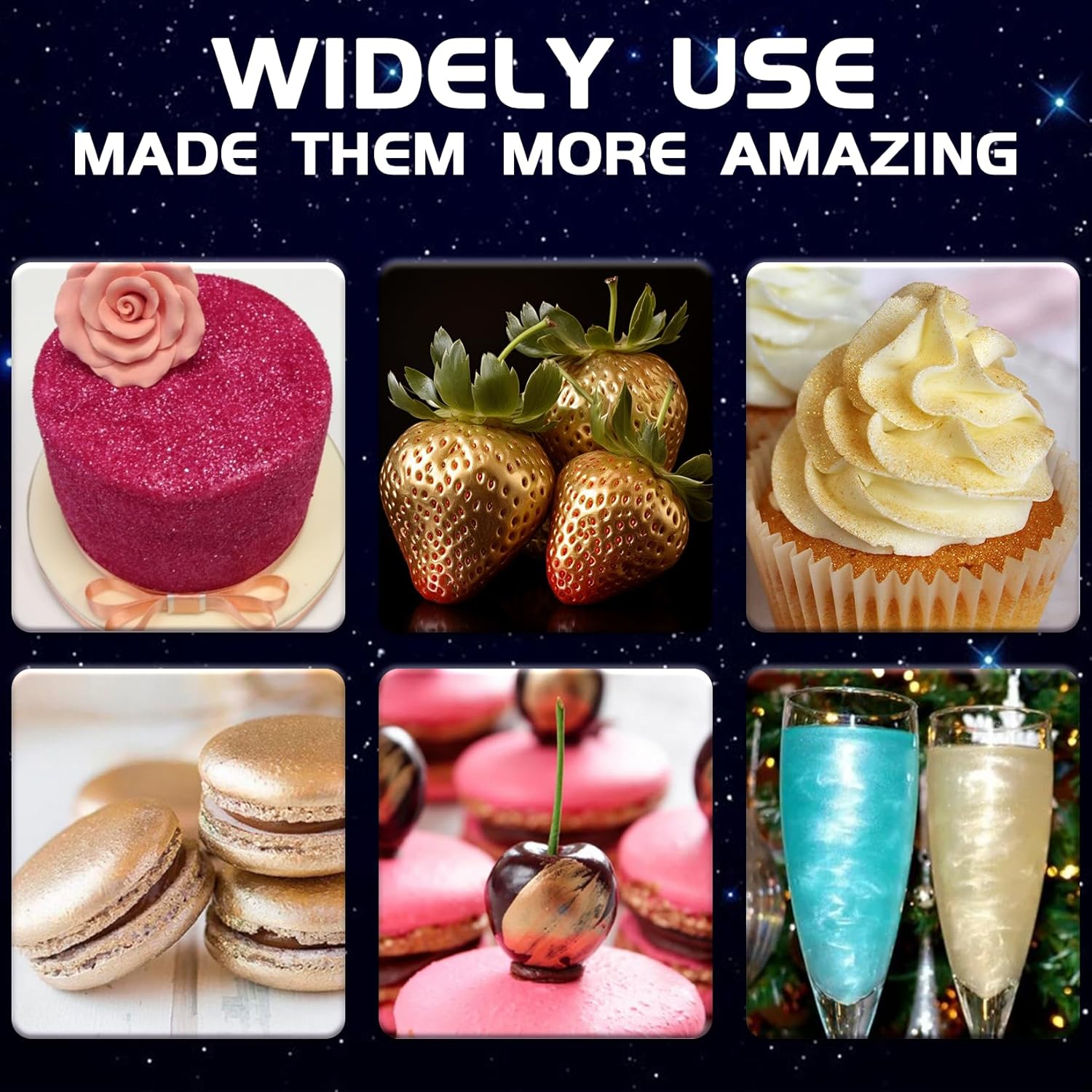 • EASY TO APPLY - The unique cap design of edible glitter allows you to control the dosage of luster dust edible very well, mix glitter sprinkles directly with drinks to make star drinks, sprinkle it directly on cakes for decoration, or use a brush to apply edible glitter for cocktails directly on molds, pour into chocolate. Please enjoy the fun of DIY desserts and drinks.