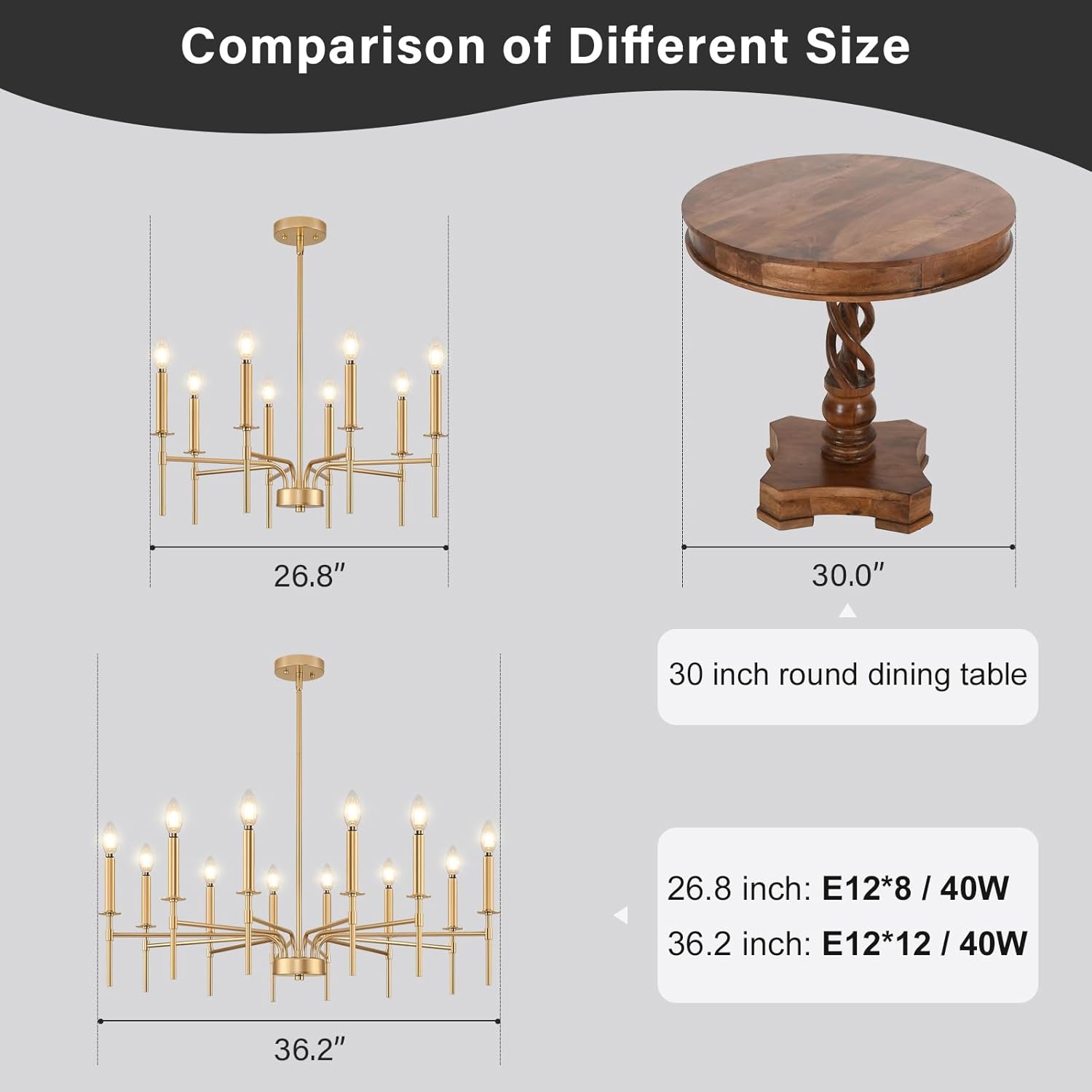 • Stylish and Widely Applicable: The 26.8-inch diameter of this large gold chandelier light fixture makes it a versatile addition to farmhouse, modern, mid-century, traditional, or contemporary spaces. It's an excellent choice for a foyer chandelier, a modern chandelier for foyer entryway, or as a statement piece in a gold dining room chandelier setting, and also ideal for a living room chandelier
