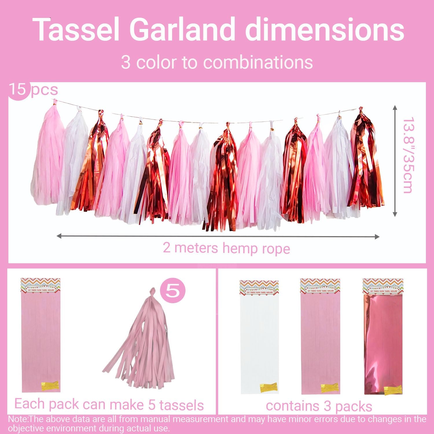 • One garland includes: 15 tassels (Rose Gold/Pink/White).5 pcs per color. Each tassel is about 12" long after assembled. And each garland comes with a 10ft long String for hanging these tassels