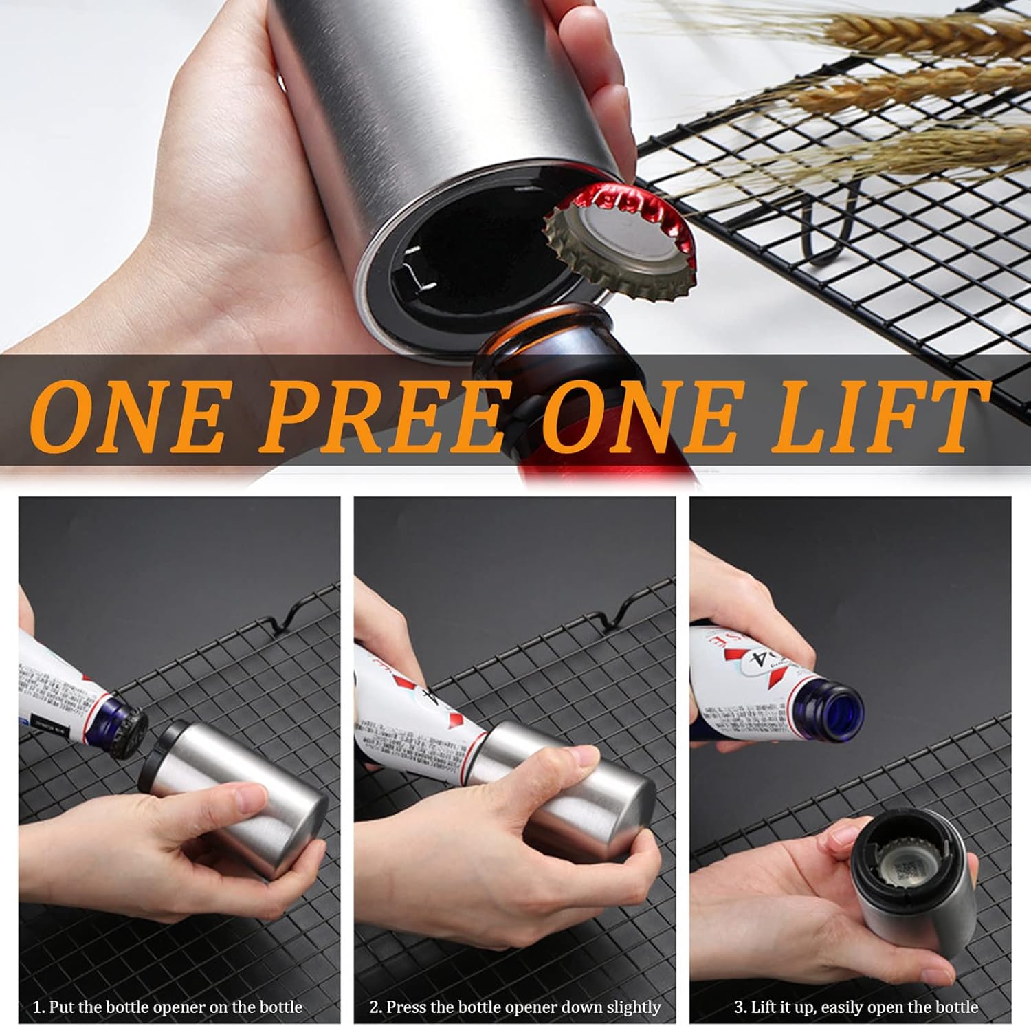 • STURDY-EXQUISITE - This magnetic automatic push down bottle opener is made of high-quality stainless steel, went through wire drawing treatment, made the beer cap opener sturdy. So this bottle opening tool has good handing feeling, and easy to clean. At the same time, the automatic bottle cap opener looks delicate and fashion. The beer bottle cap opener is not only a practical and pop the top bottle opener, but also a delicate decoration for your kitchen. Love destapadores de cerveza!