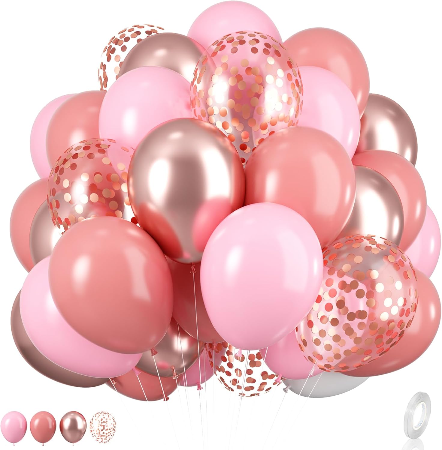 • 12 Inch rose gold pink balloons: Package content includes 9 pcs rose gold balloons, 5 pcs confetti rose gold balloons, 9 pcs pink balloons,7 pcs retro pink balloons, a balloon ribbon.The color combination meets all your party imagination.