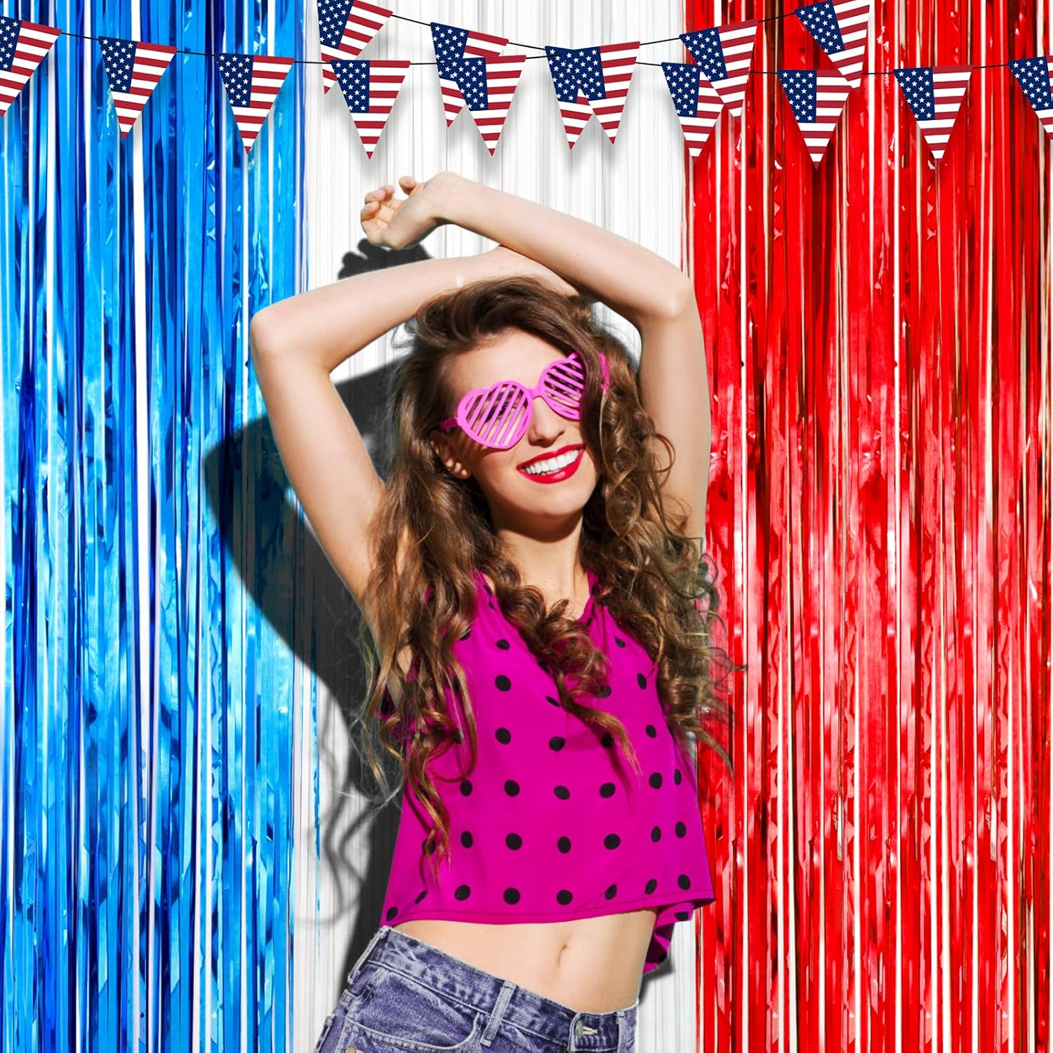 • Premium Material: This Red White and Blue foil curtain backdrop is made of stable tinsel, non-fading, stay shiny and reusable. Unfold it and then enjoy your glittering party