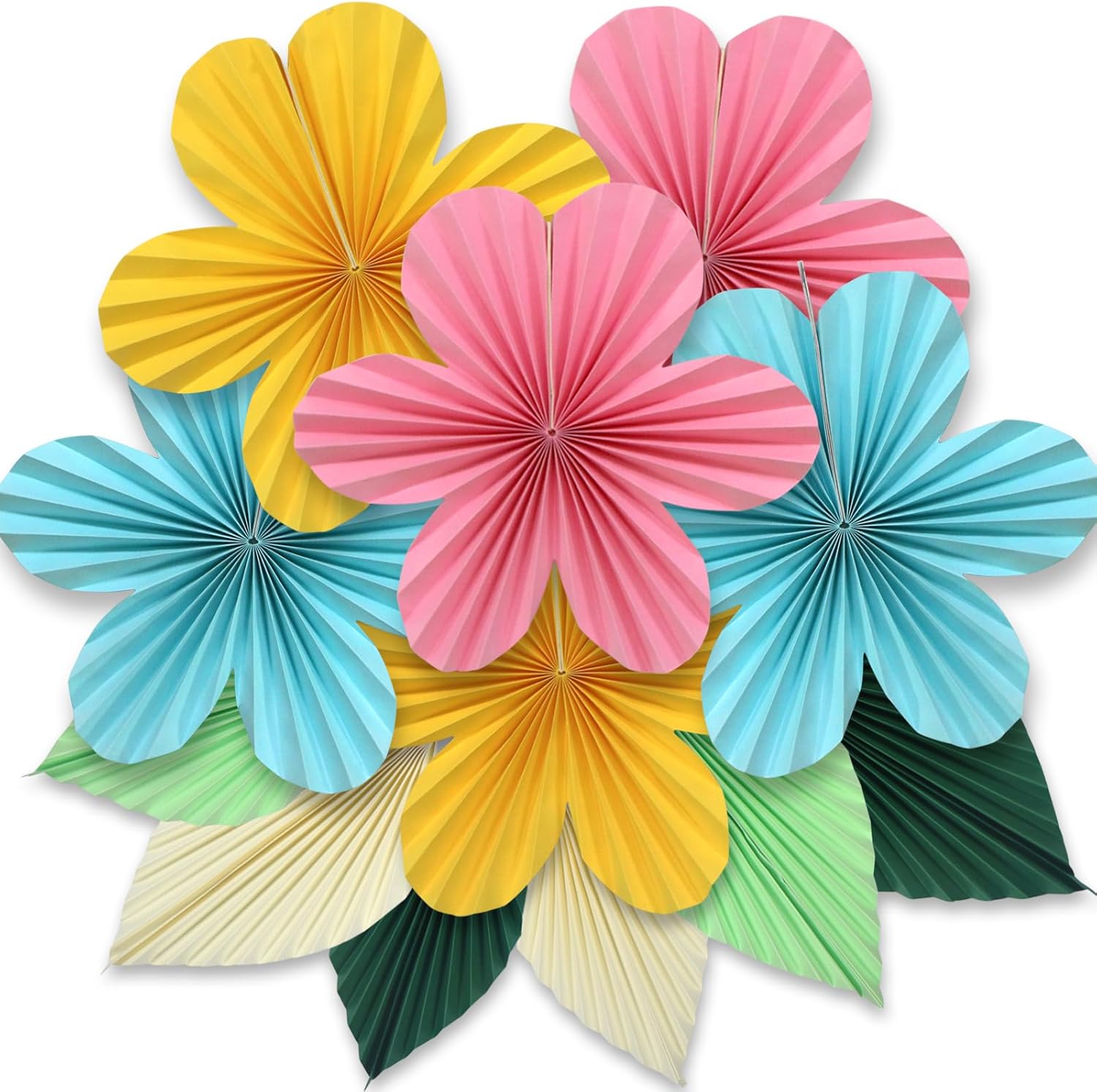 • Package contents: Hanging flower fans and leaves party decorations set includes 6pcs 12-inch paper flowers in yellow, pink, and blue colors. 6pcs paper leaves in green(diameter :12 "* 3/10" *3).