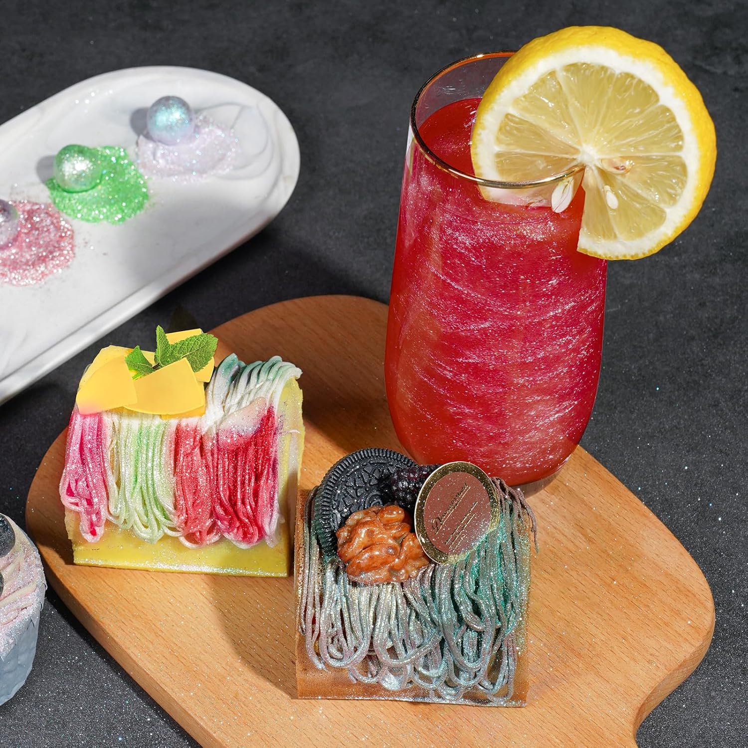 • ✔️【Use with Brews】Food-grade glitters are so fun and simple to use with brews. Add one pinch or two directly to your favorite beverage, mix it with cocktail syrups, juices, liqueurs, liquors, or spirits. Use a clear glass instead of opaque containers so that the liquid looks so cool, especially when you move it around in the glass with a stir. A tiny amount of dust can create a great visual spectacle, and clear liquids offer a great blank canvas for glitter to show off the best ability.