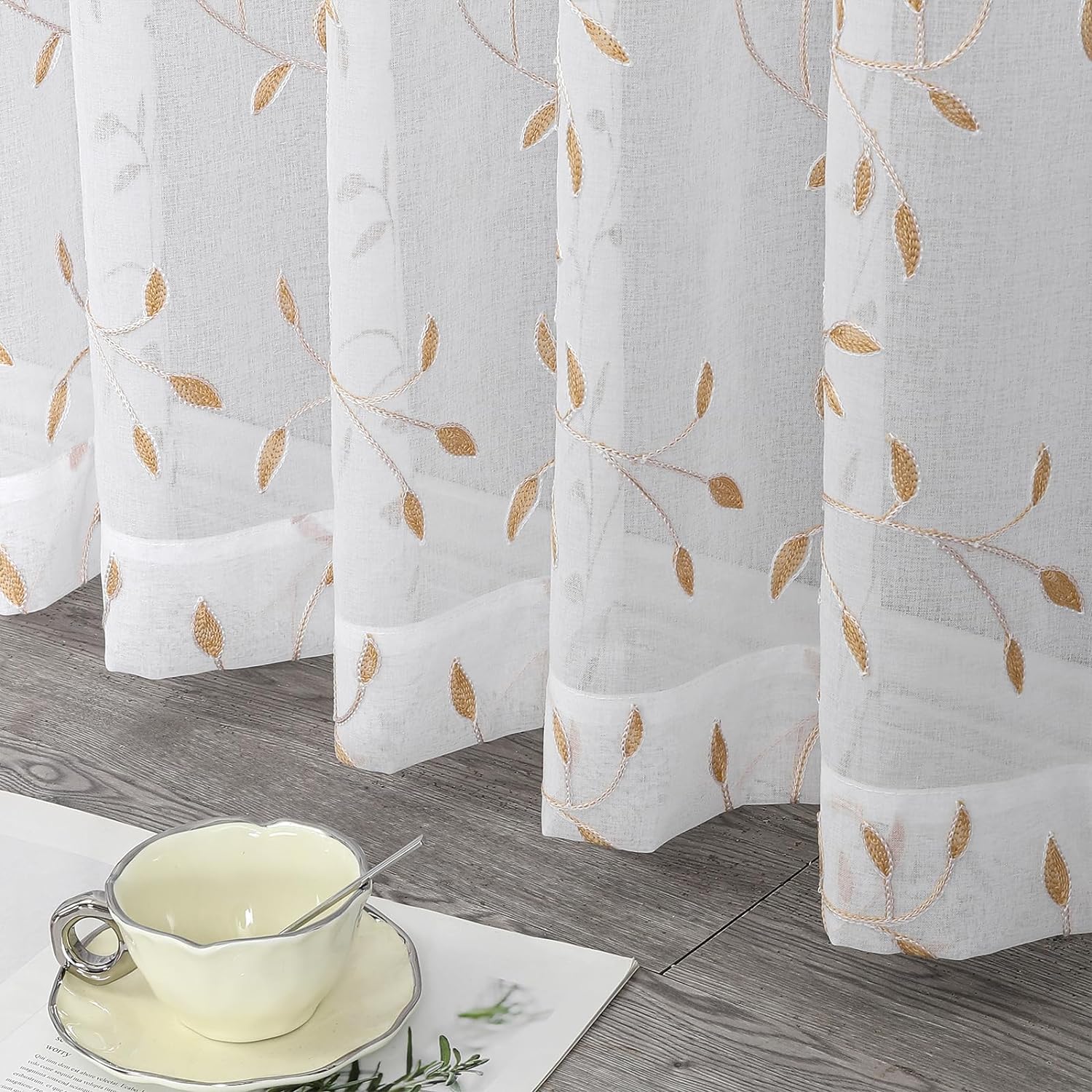 VISIONTEX White Sheer Voile Curtains, Decorative Orange Leaves Embroidery Faux Linen Rod Pocket Window Drapes for Home Kitchen, Living Room and Bedroom 54 x 95 Inch, Set of 2 Curtain Panels