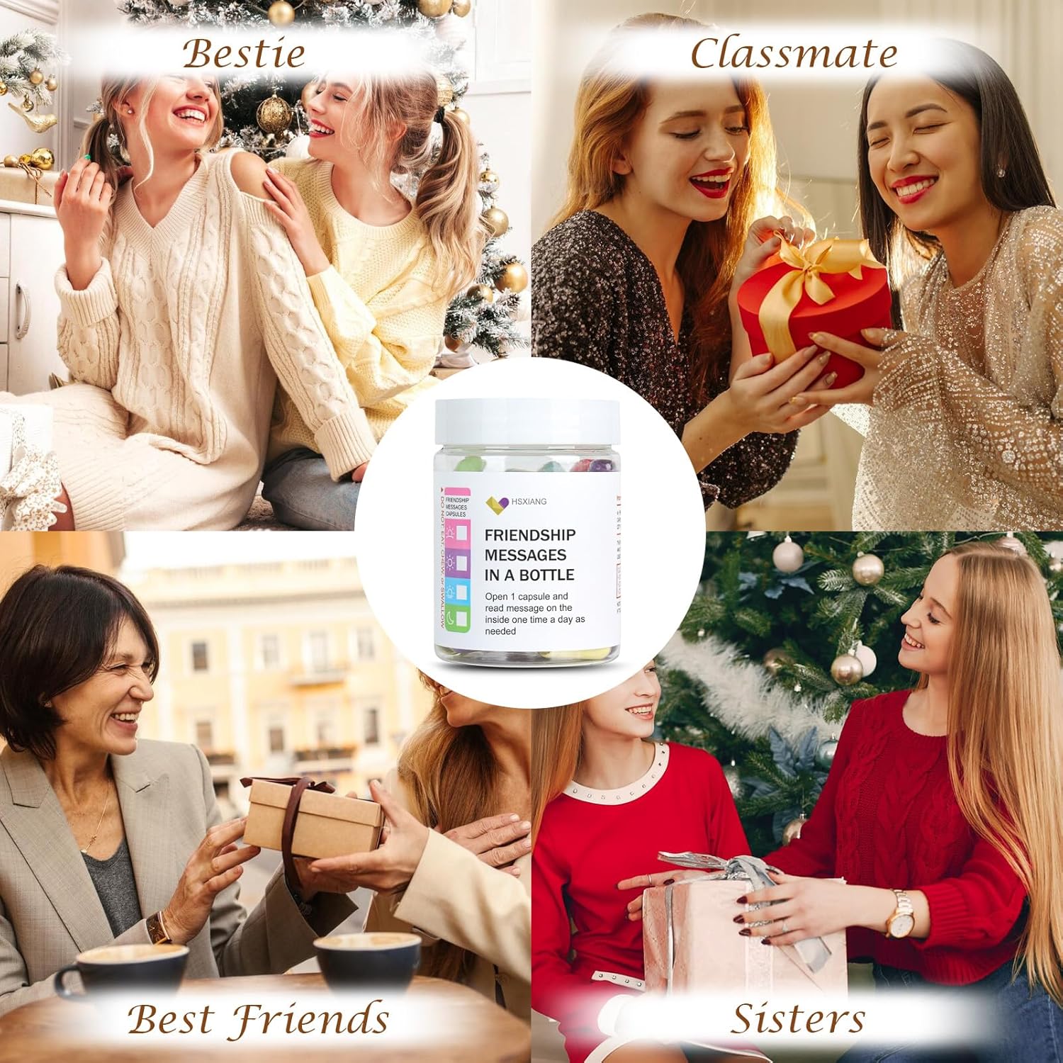 • WHAT'S INCLUDED?: Including 50+pre-written friendship messages; A sturdy and transparent beautiful plastic bottle; A friend prescription card; A beautiful gift box; (No need to repackage as a gift).