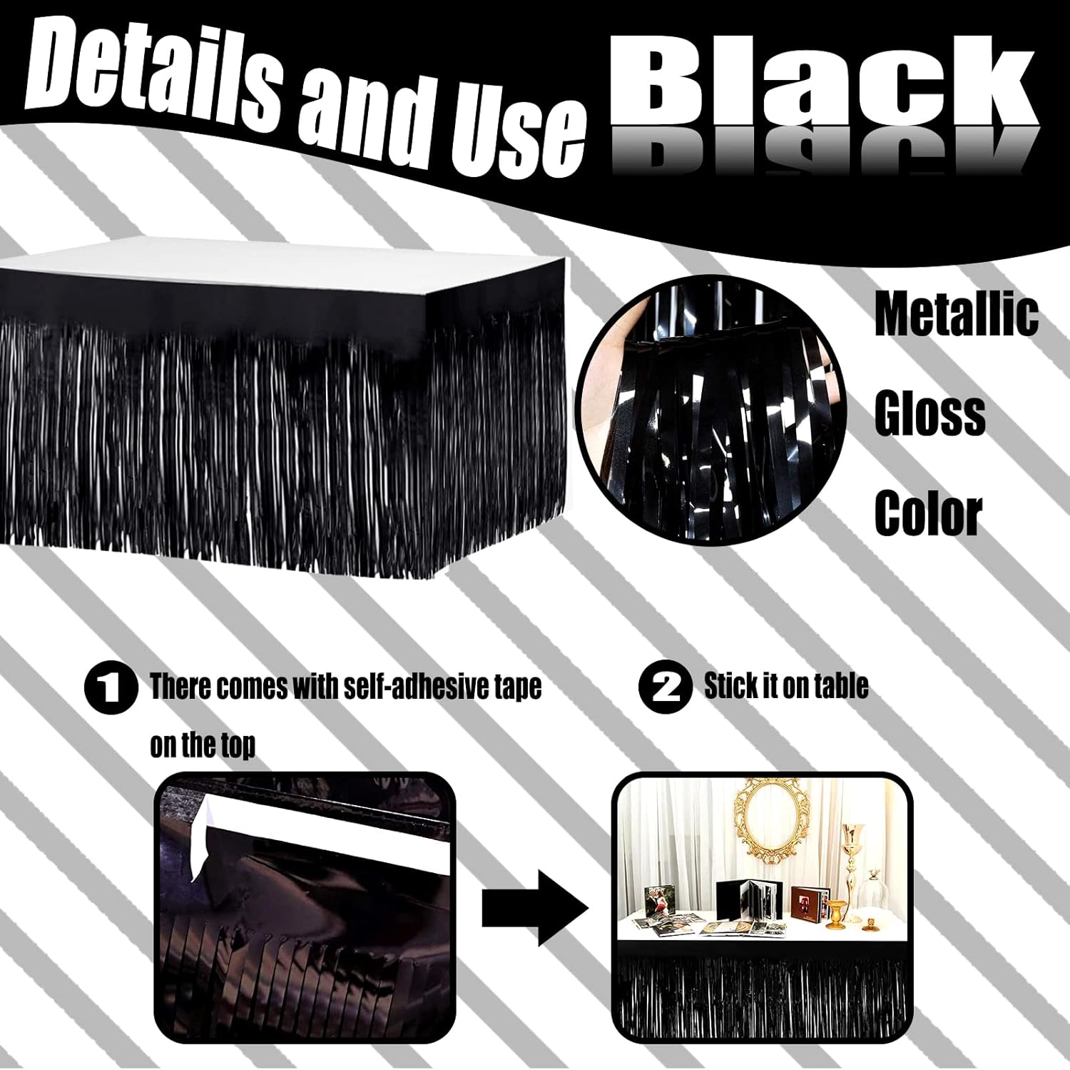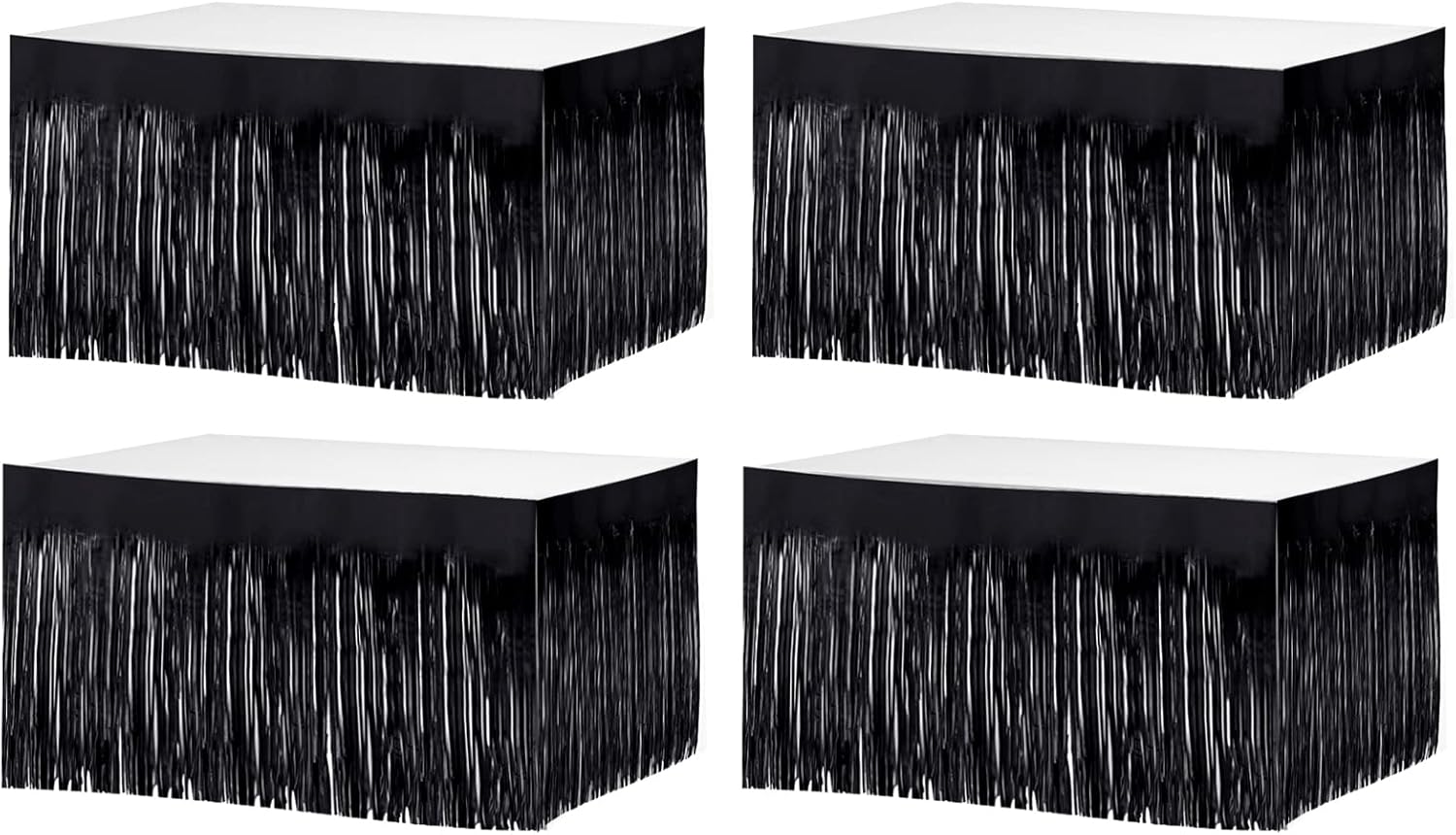 4 Pack 29x108 Inch Metallic Foil Fringe Tinsel Table Skirts for Rectangle Tables Streamer Curtains Backdrop for Halloween, Birthday, Parade Floats, Christmas Party Supplies(Black)