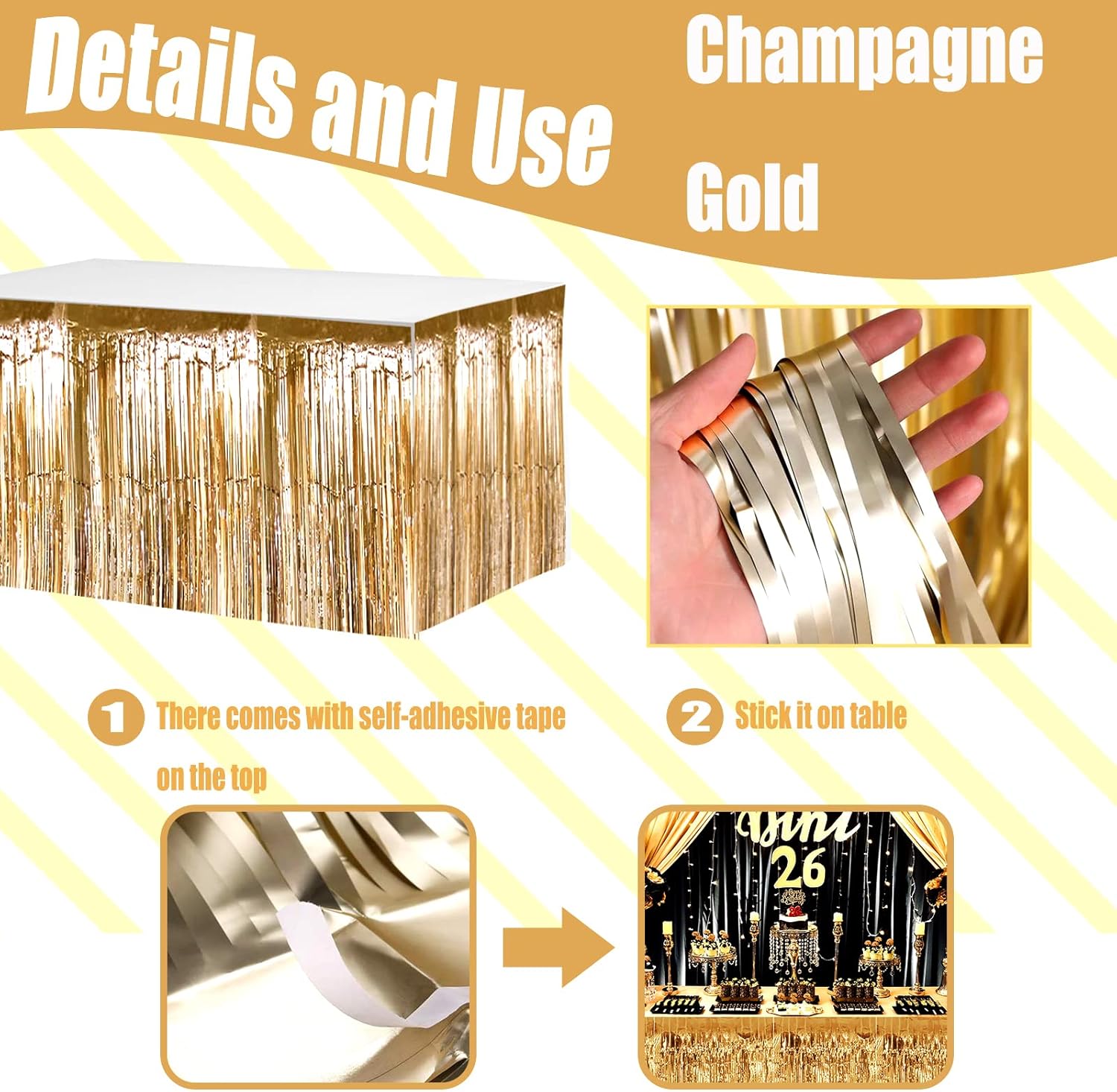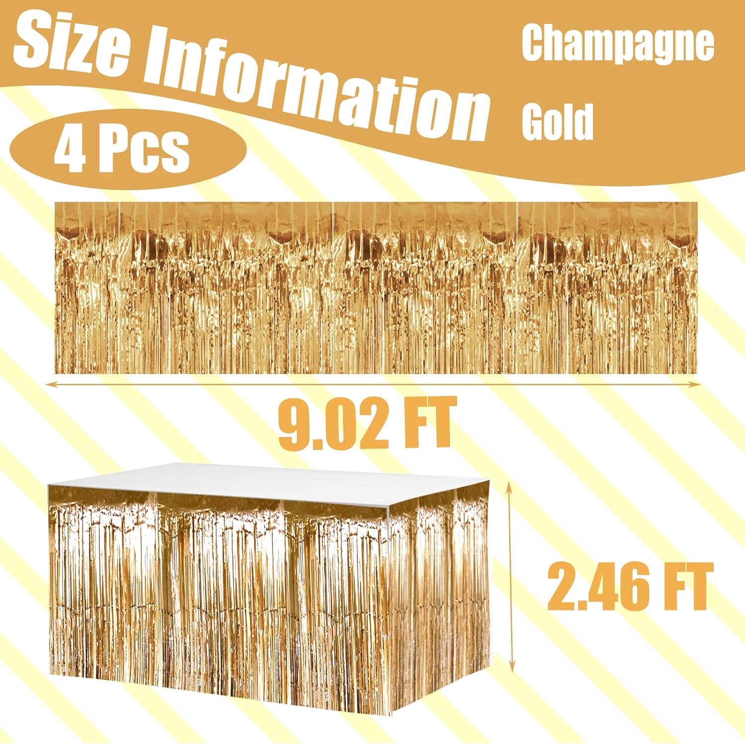 4 Pack 29x108 Inch Metallic Foil Fringe Tinsel Table Skirts for Rectangle Tables Streamer Curtains Backdrop for Christmas, Birthday, Parade Floats, Halloween Party Supplies(Champagne Gold)
