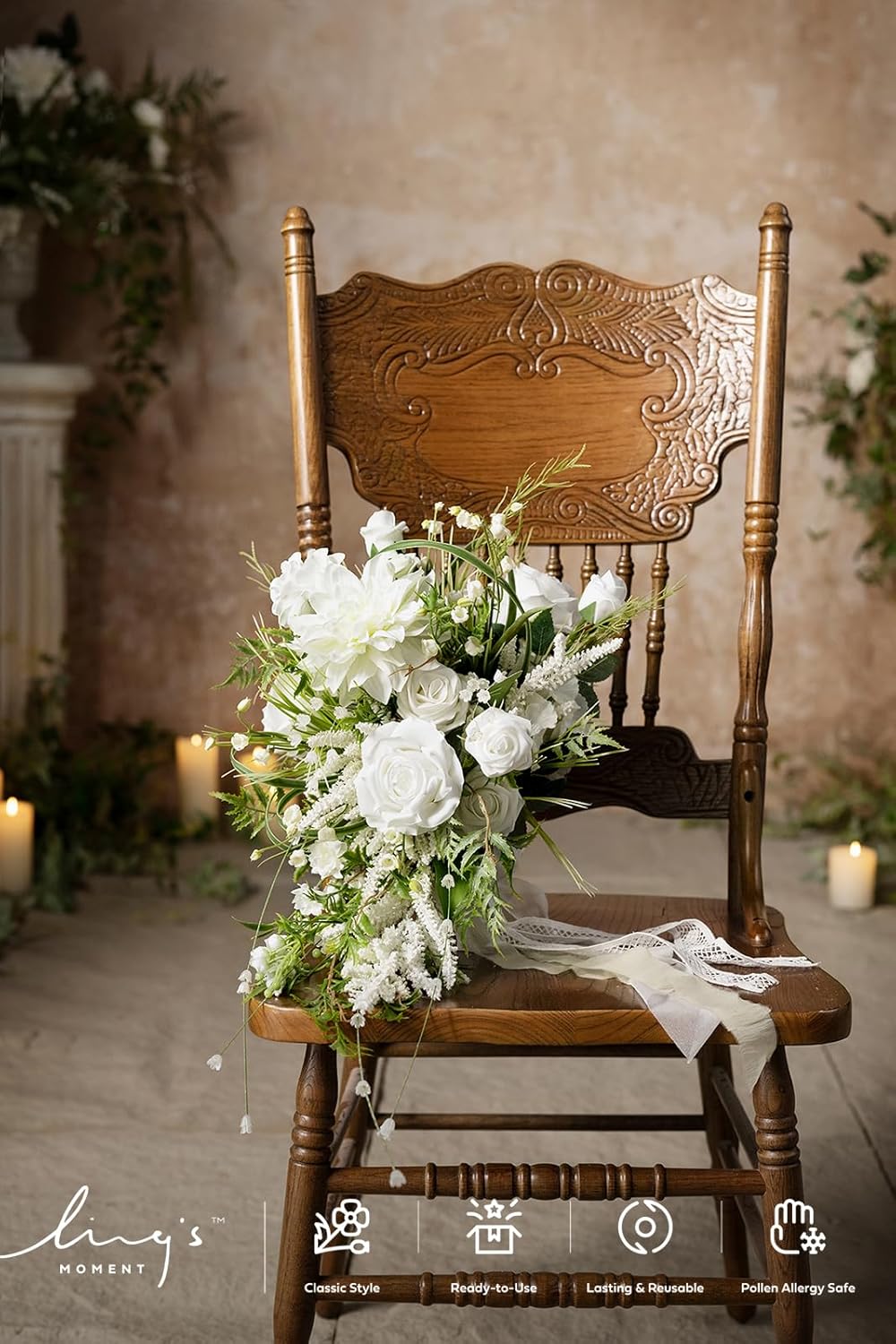 • NEVER WILTED: Compared to fresh flowers, Save over 50% on your budget with this realistic bouquet, crafted from foam/silk flowers White Rose Bud, High-Centered Rose, Gardenia, Lily Of The Valley, Delphinium, Ivory Rose And Dahlia, Astilbe and Light Green Steel Grass Line, Holly Leaves, Polish Grass, Bamboo Peak Grass, Fountain Grass, Needle Grass. These bouquets never wilt, staying beautiful forever, making them the perfect keepsake for your big day.
