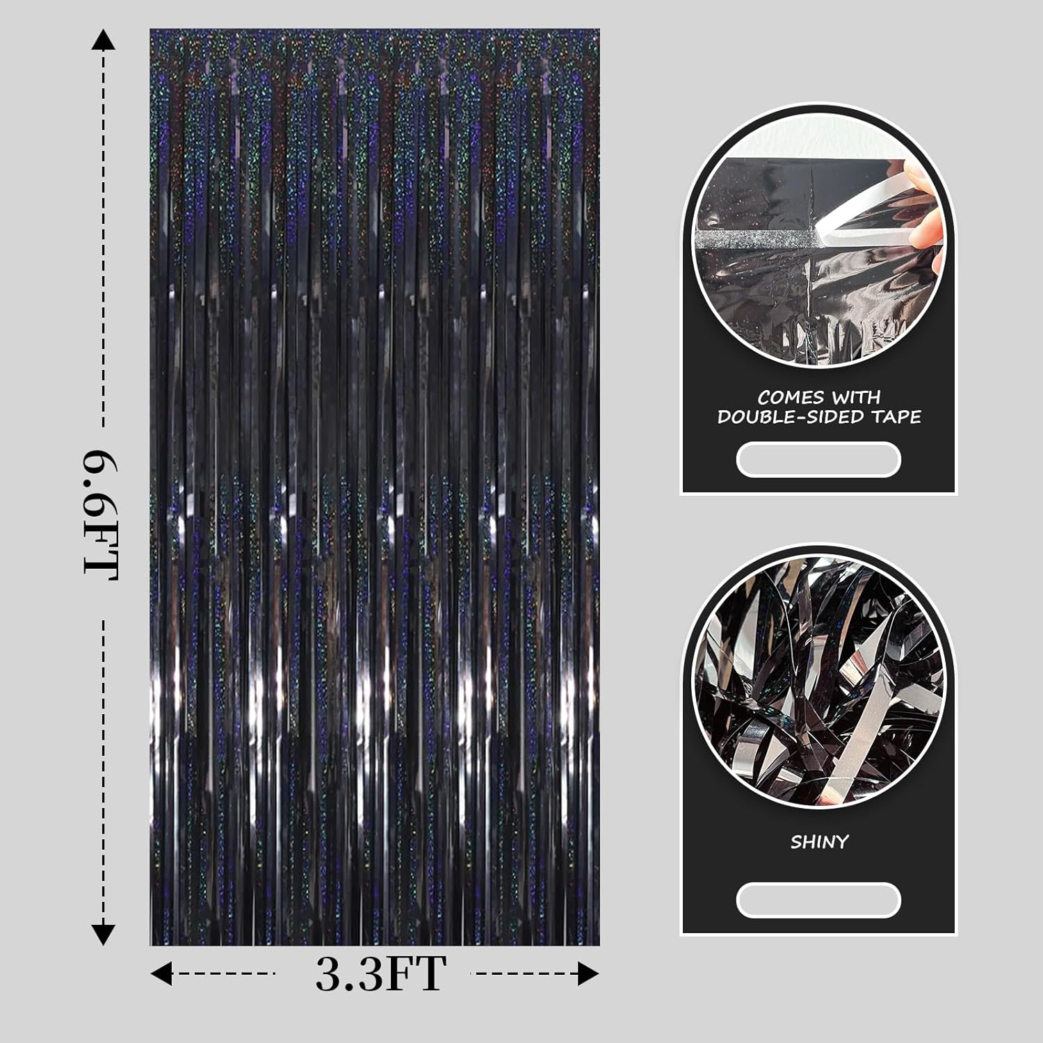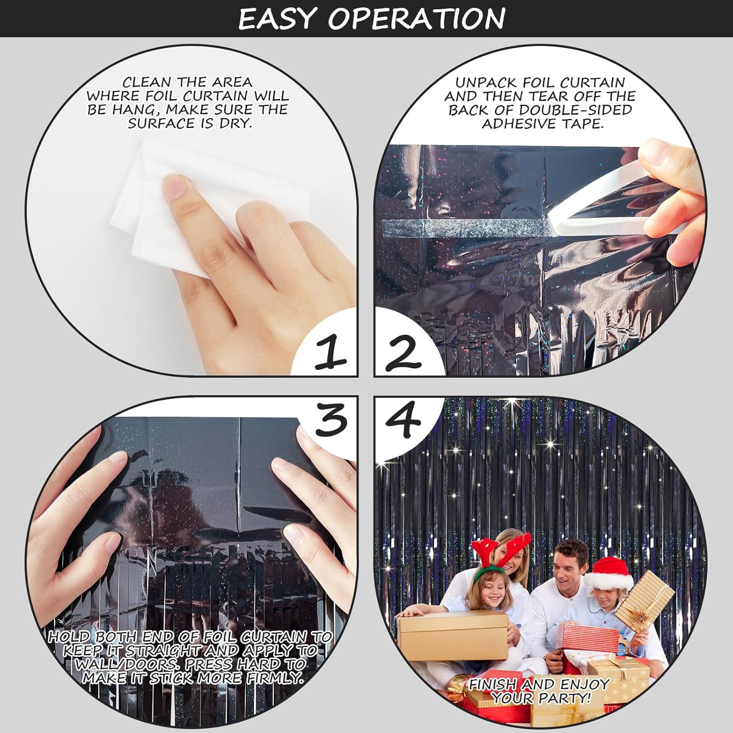 QRabbit 4 Pack Black Tinsel Foil Fringe Curtains - 3.3x6.6 Ft Metallic Party Streamers Backdrop for Birthday Wedding Christmas Party Decor, Self-Adhesive Photo Booth Wall Door Decorations