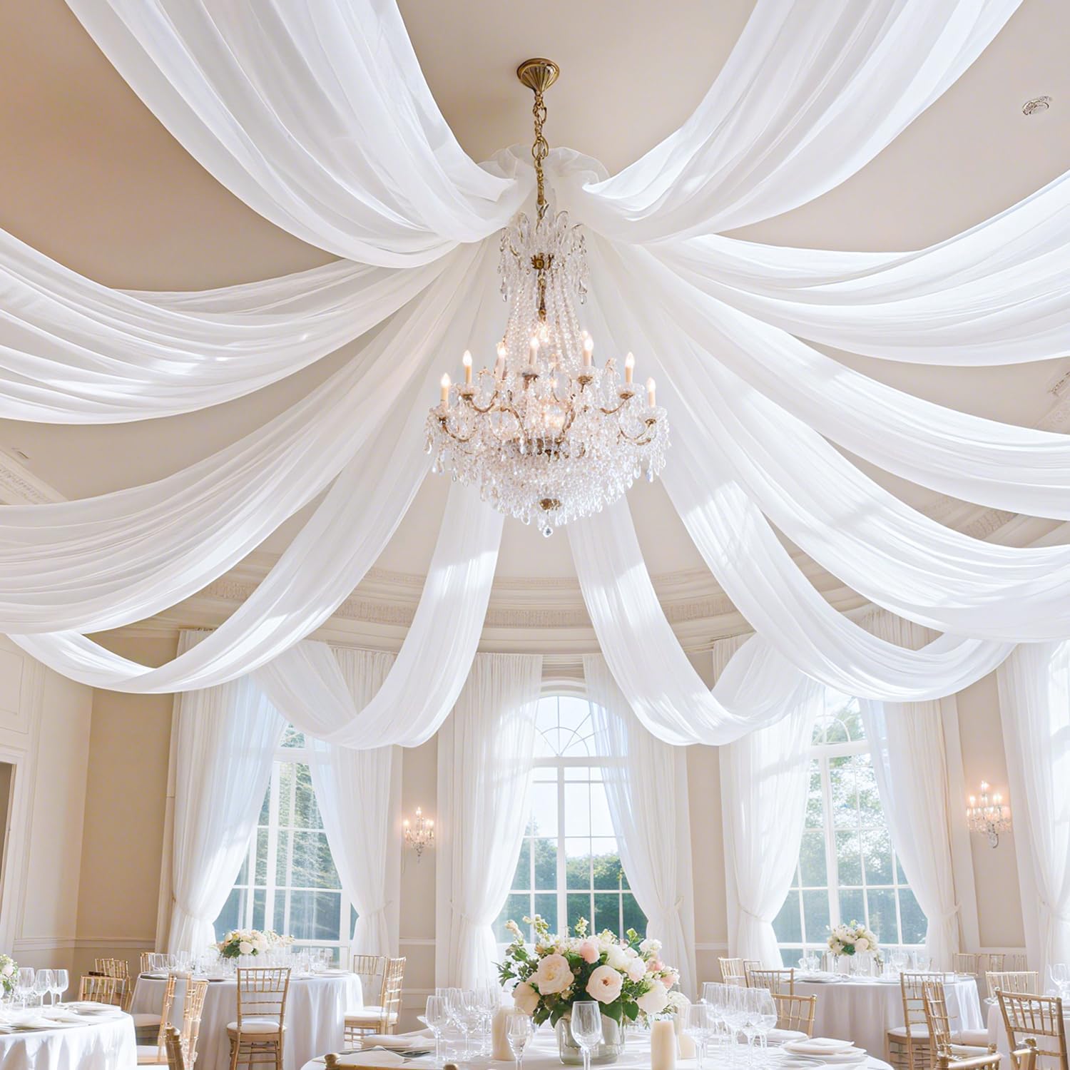 • ✿【Size of Ceiling Drapes】Package includes 2 panels white wedding ceiling drapes. Size of each panel is 5FT( 60 inches) width by 30FT( 360 inches) length. This ceiling drapes for weddings can help your party to create a warm and elegant scenes.