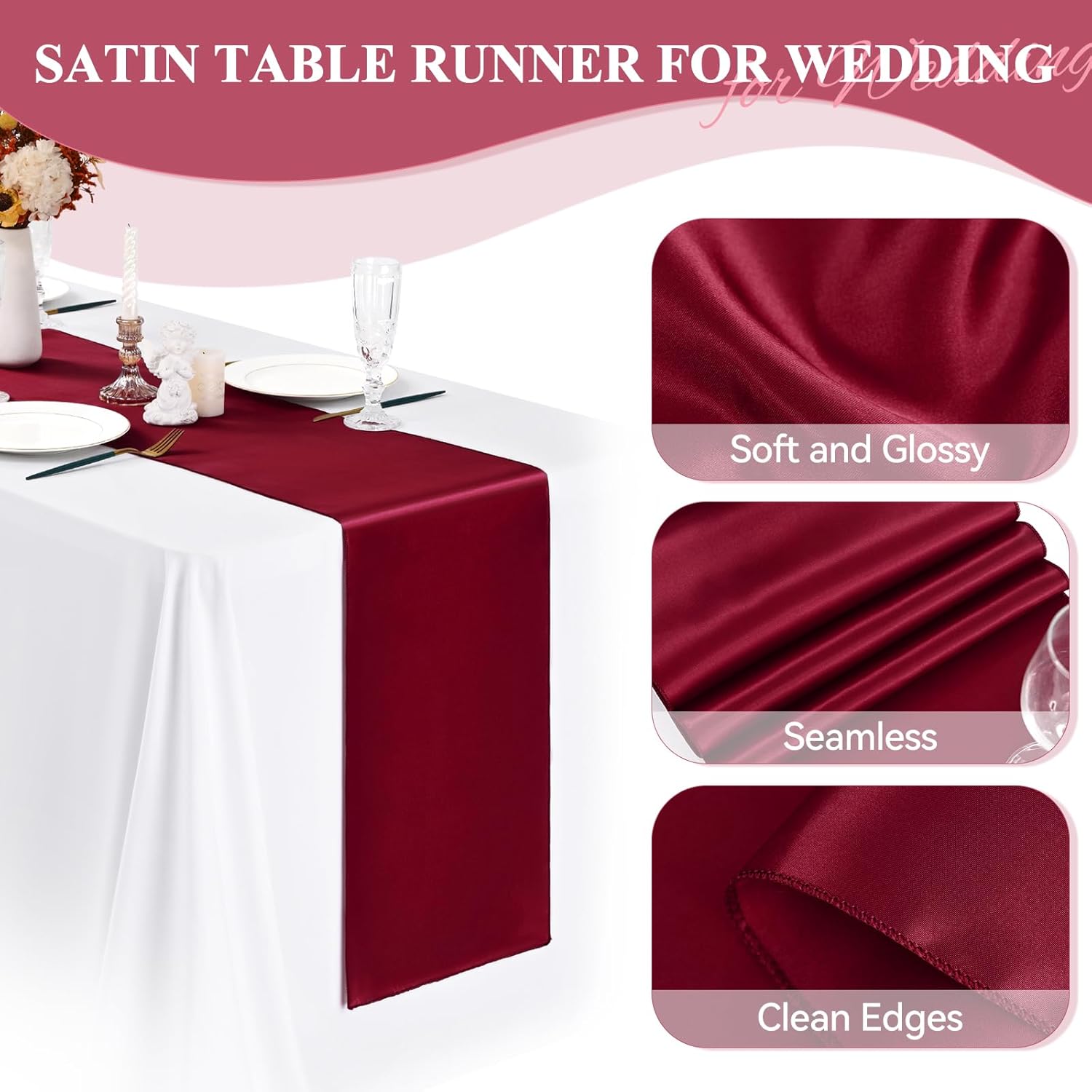 • 🍷【Excellent Service】The satin table runner can be hand or machine wash. Reusable.No-shrink, No color ran, Wrinkle-free.High quality satin table runners make your party, wedding more attractive and Romantic.We promise our satin table runner is high quality.If you have any questions, please let us know.We will 100% responsible for those Low probability misfortune orders.
