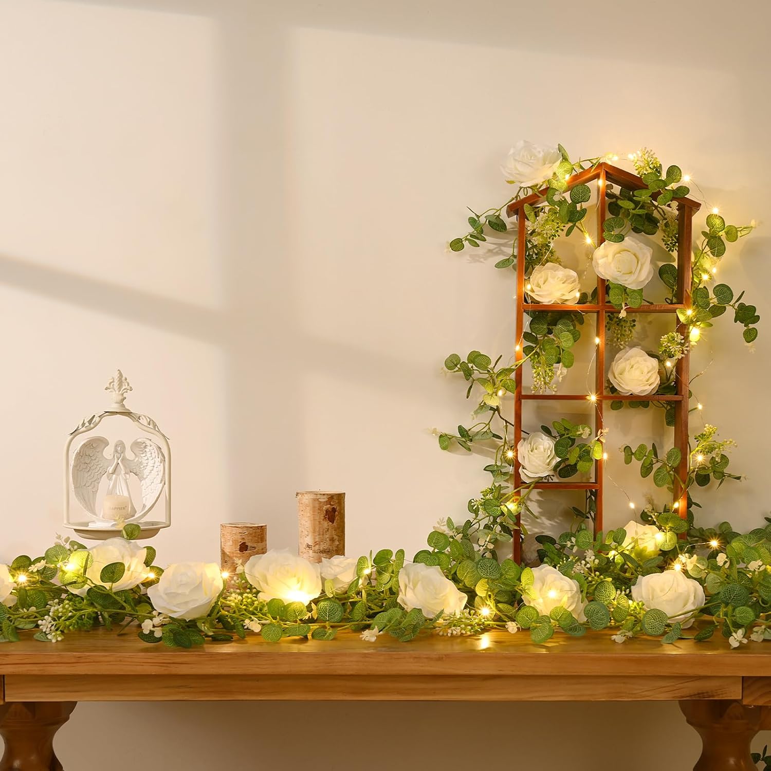 Dolicer 2Pcs 13Ft Artificial Eucalyptus Garlands with Flowers - 8 Roses, Faux Floral Greenery Garlands with 13Ft String Lights Fake Flower Vines for Wedding Table Centerpieces Arch Party Decor (White)