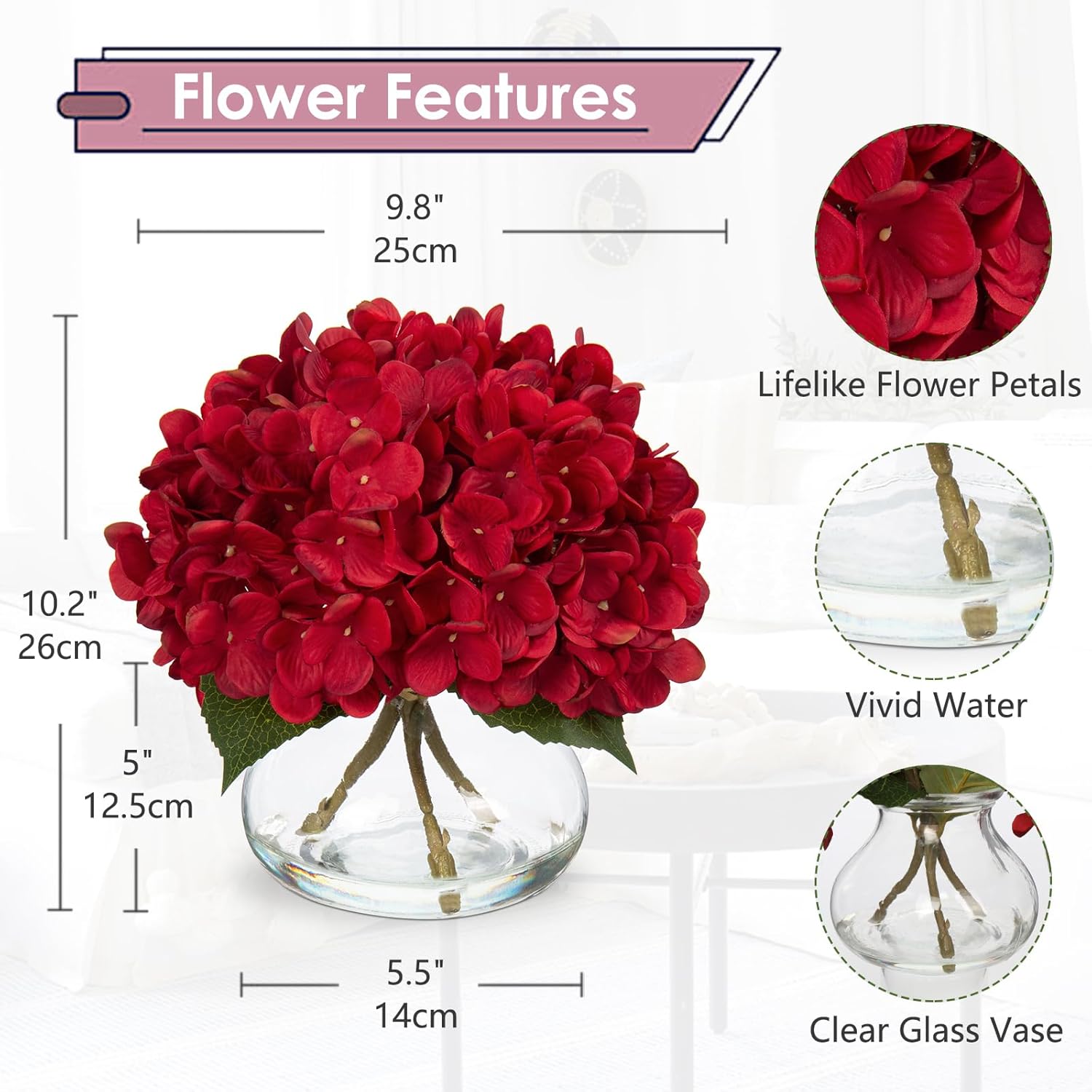 Hollyone Hydrangea Artificial Flowers in Vase Red Silk Fall Fake Flowers Arrangements with Glass Vase with Faux Water Faux Floral Bulk Bouquet for Office Table Centerpiece Shelf Home Decorations
