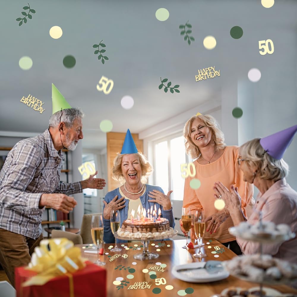 Sage Green 50th Happy Birthday Confetti, 50th Birthday Table Decorations Scatter Green Gold Foil Cake Confetti Decorations for 50 Bday Women Men Party Decor 230 Pcs