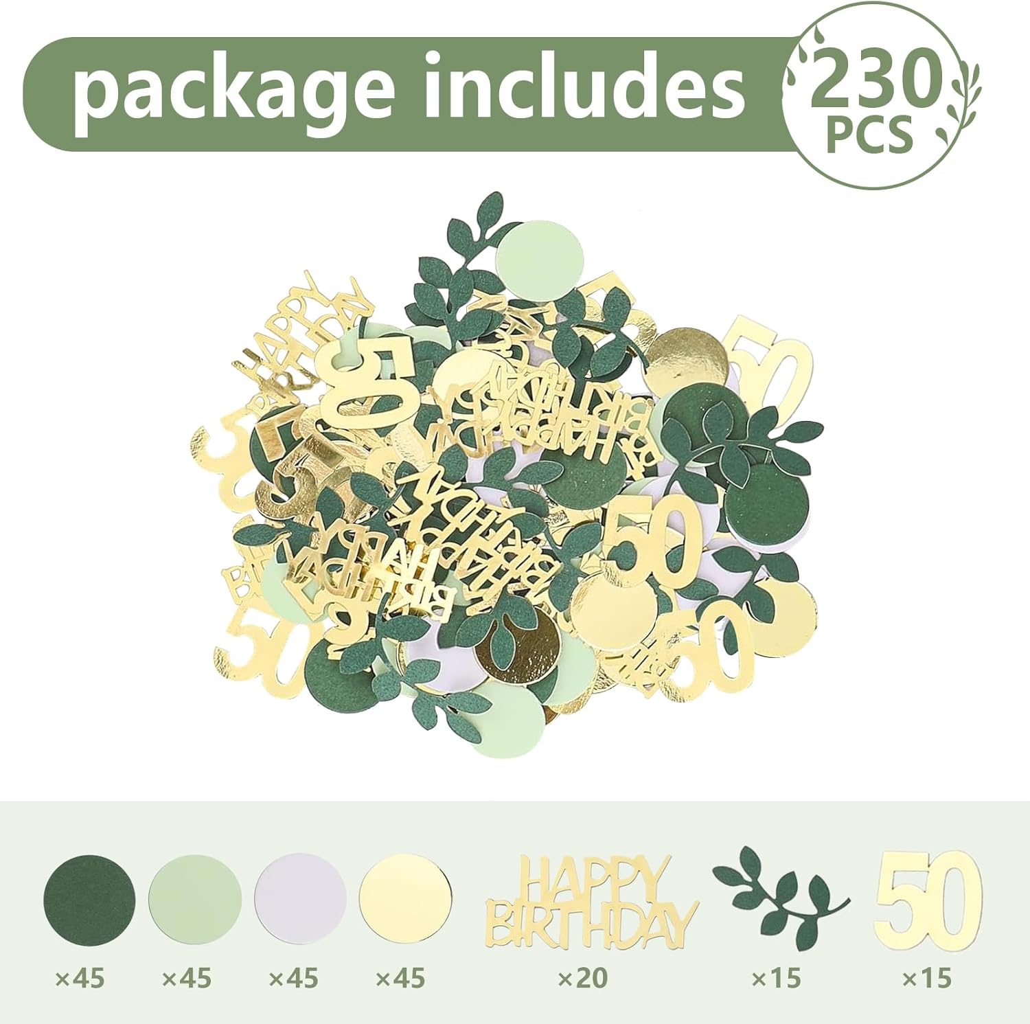 • 【YOU WILL GET】You will receive 50th Sage Green Gold Happy Birthday Confetti 230 pieces in 4 different colors (sage green, gold, white, dark green) green eucalyptus leaves and gold happy birthday, which can meet your various decoration needs.