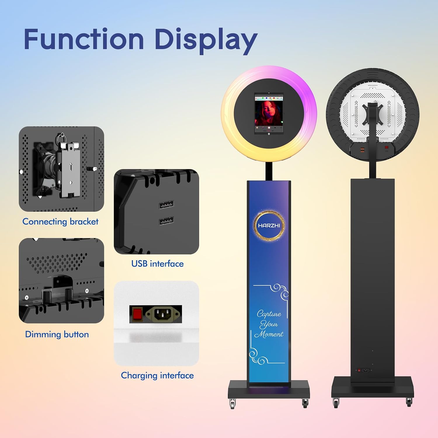 • 【Software Control Feature】 Our software provides free VIP services, allowing users to manipulate lighting colors, apply filters, add graphics when taking photos. Additionally, it seamlessly connects to printers for on-spot photo printing. Our software also supports a real-time RGB lighting preview in the photo capture interface, enabling users to quickly identify and select their optimal lighting preferences. For 12.9-inch iPads before 2018, please contact us for customized panels.