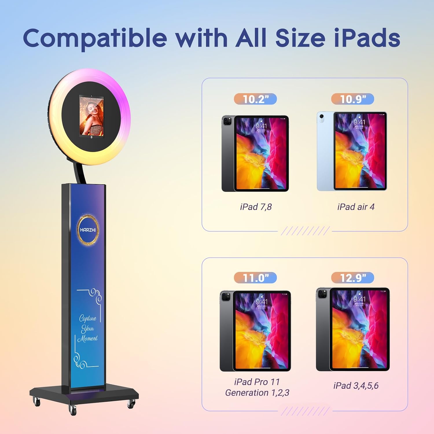 • 【Full-size iPad Compatibility】 Our product is compatible with all iPad sizes, including 10.2-inch, 10.9-inch, and 12.1-inch models. Regardless of the iPad size you own, our photo booth accommodates them seamlessly, providing a versatile and user-friendly experience.