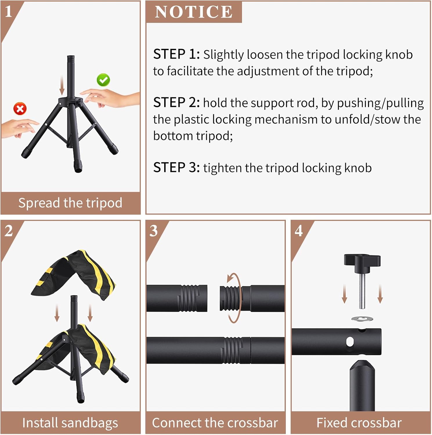• 【Sturdy and durability】The material of the background bracket is made of high-quality aluminum alloy, which can support the weight of the background wall, you need to hold the support rod when you open the tripod base, press the plastic lock to unfold the bottom of the tripod, to prevent over-exertion of the backdrop support rod bending.