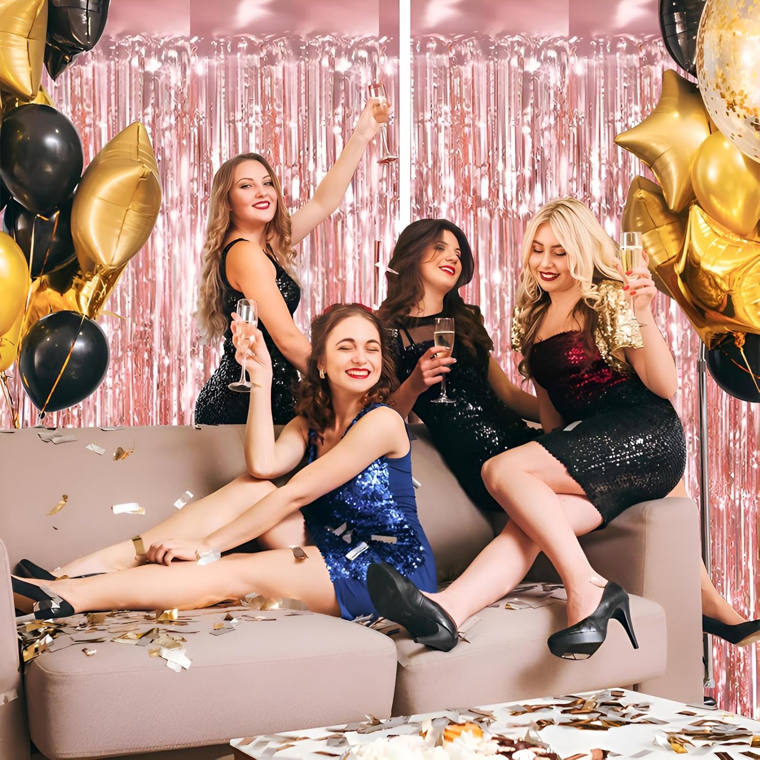 • Pair with other party decorations: Tinsel backdrop curtain can be paired with LED lights, balloons, banners, wreath, garlands, swirl streamer, tissue paper pom poms.