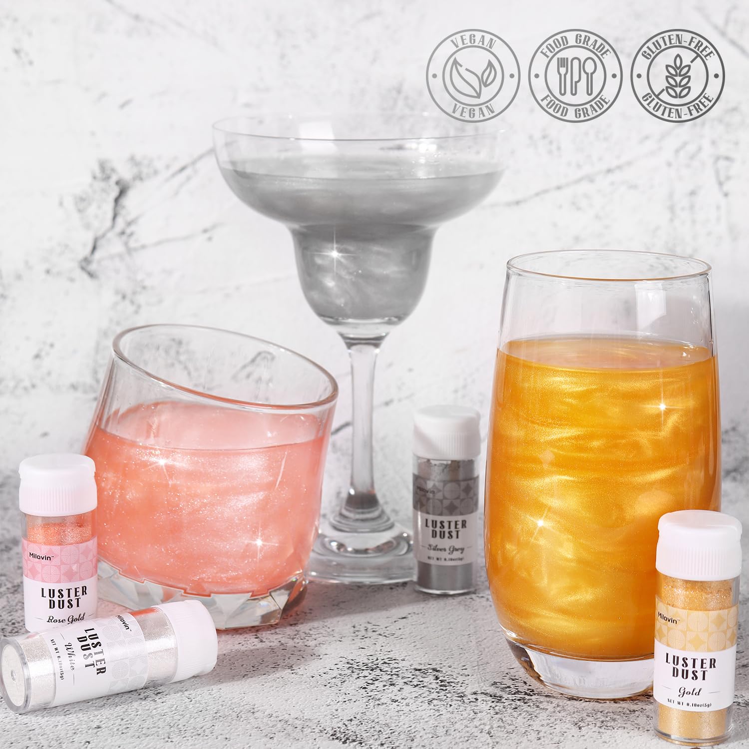 • Edible Glitter for Cocktails: Edible glitter set including gold edible glitter, rose gold glitter, white edible glitter, and silver edible glitter. Made of food-grade mica powder and food coloring. Odorless, Tasteless, Vegan, nut-free, gluten-free