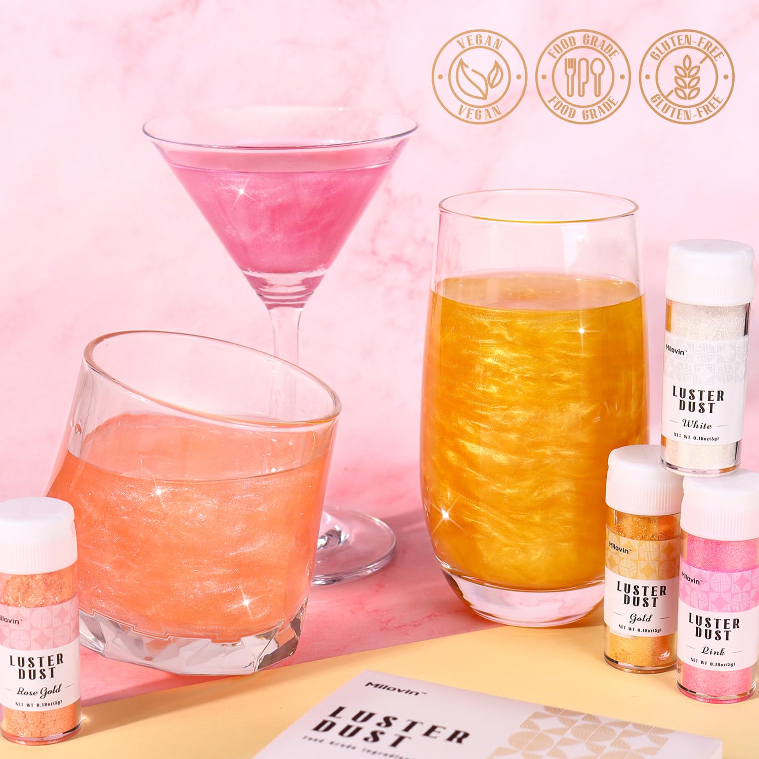 • Edible Glitter for Cocktails: Including gold edible glitter, rose gold glitter, white edible glitter, and pink edible glitter. Made of food-grade mica powder and food coloring. Odorless, Tasteless, Vegan, nut-free, gluten-free