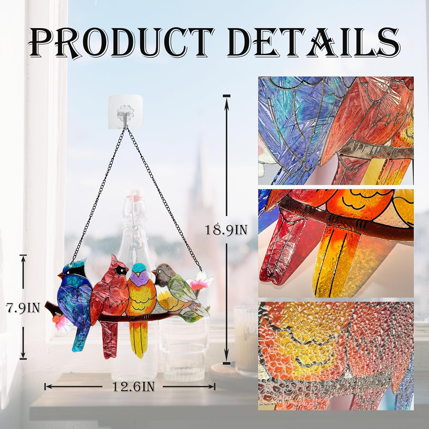• Timeless Beauty and Elegance:Our stained glass window hanging colors are so vibrant & it's well made,There are different textures to the birds.Whether you're a bird lover or simply appreciate the beauty of stained glass. It adds a nice pop of color to the outdoor winter gloom you see through the windows.
