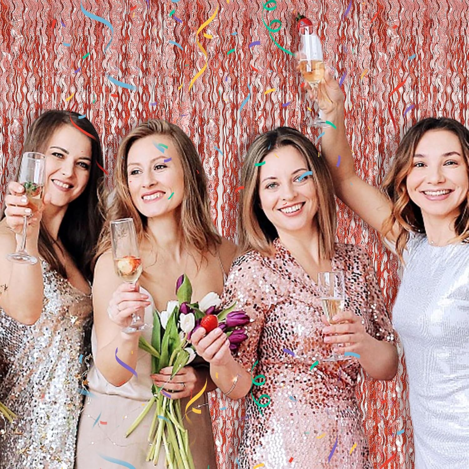 Rose Gold Tinsel Foil Fringe Curtains Wavy Backdrop for Parties Sparkle Metallic Wavy Foil Fringe Backdrop Curtain Photo Booth Props Birthday Graduation Wedding Bachelorette Party Decorations