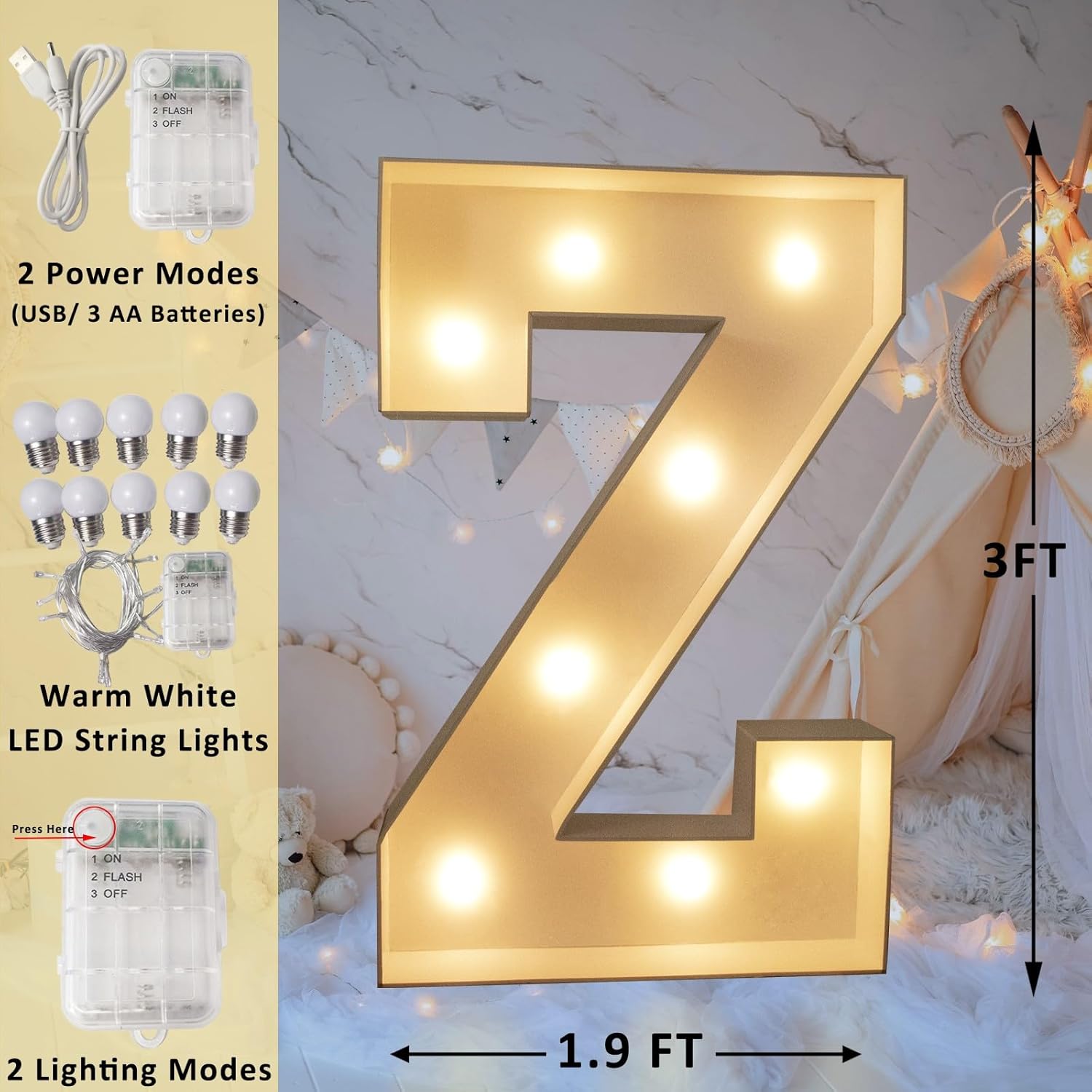 • Marquee letters with led light bulbs: Mosaic letters are designed with warm white LED string lights. With 2 Lighting modes for choice, steady and twinkle. Press the button on battery box to control the lights of large marquee letters. Giant LED Letters can be powered by 3 AA batteries (Not Included) or USB, suitable for all kinds of party decoration