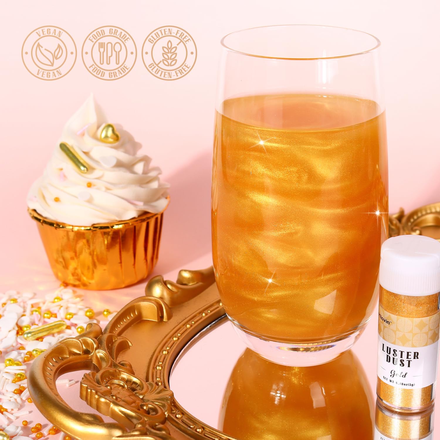 • Gold Luster Dust Edible: Made of food-grade mica powder and food coloring, odorless, and tasteless. It makes the food add a magical color and more vivid, and it doesn't affect the texture! Vegan, nut-free, gluten-free, adults or kids can be safe to use
