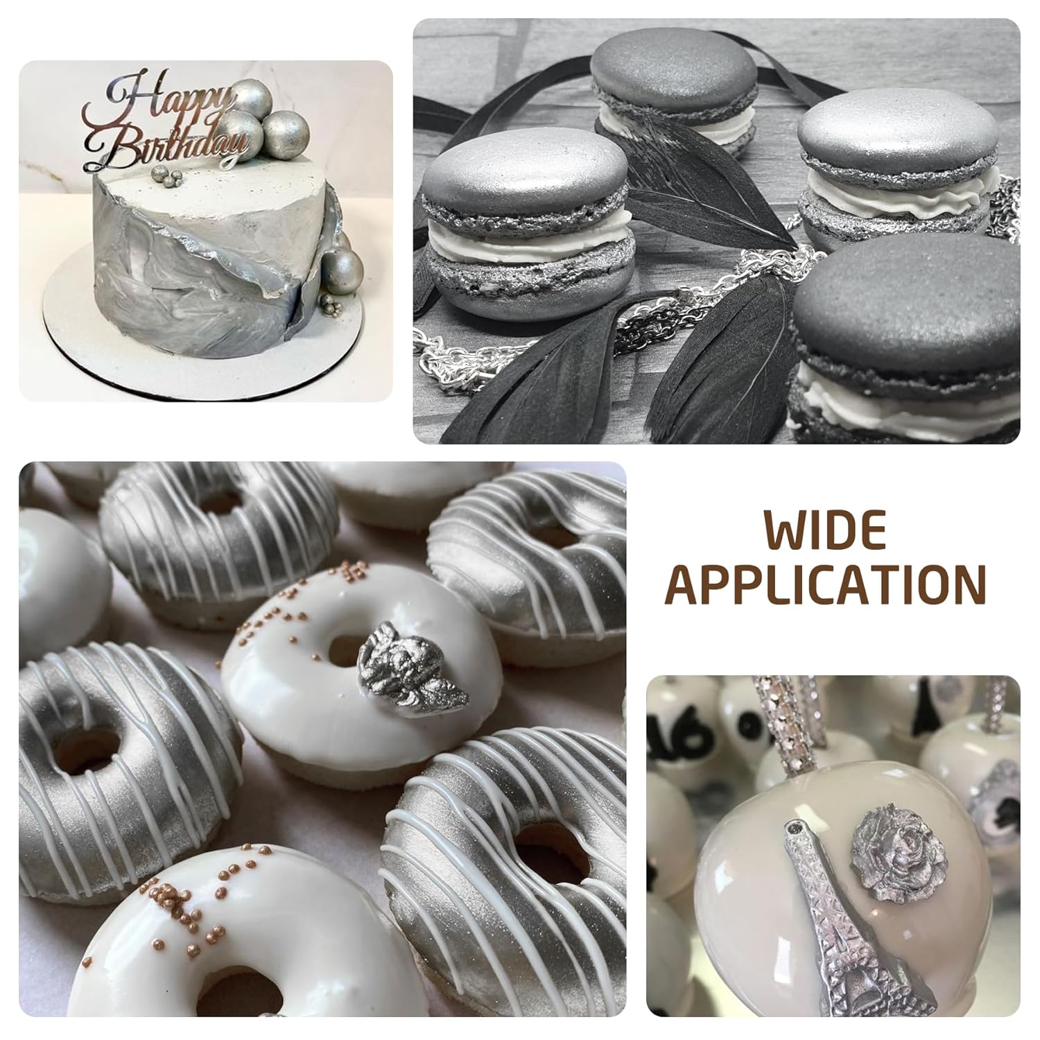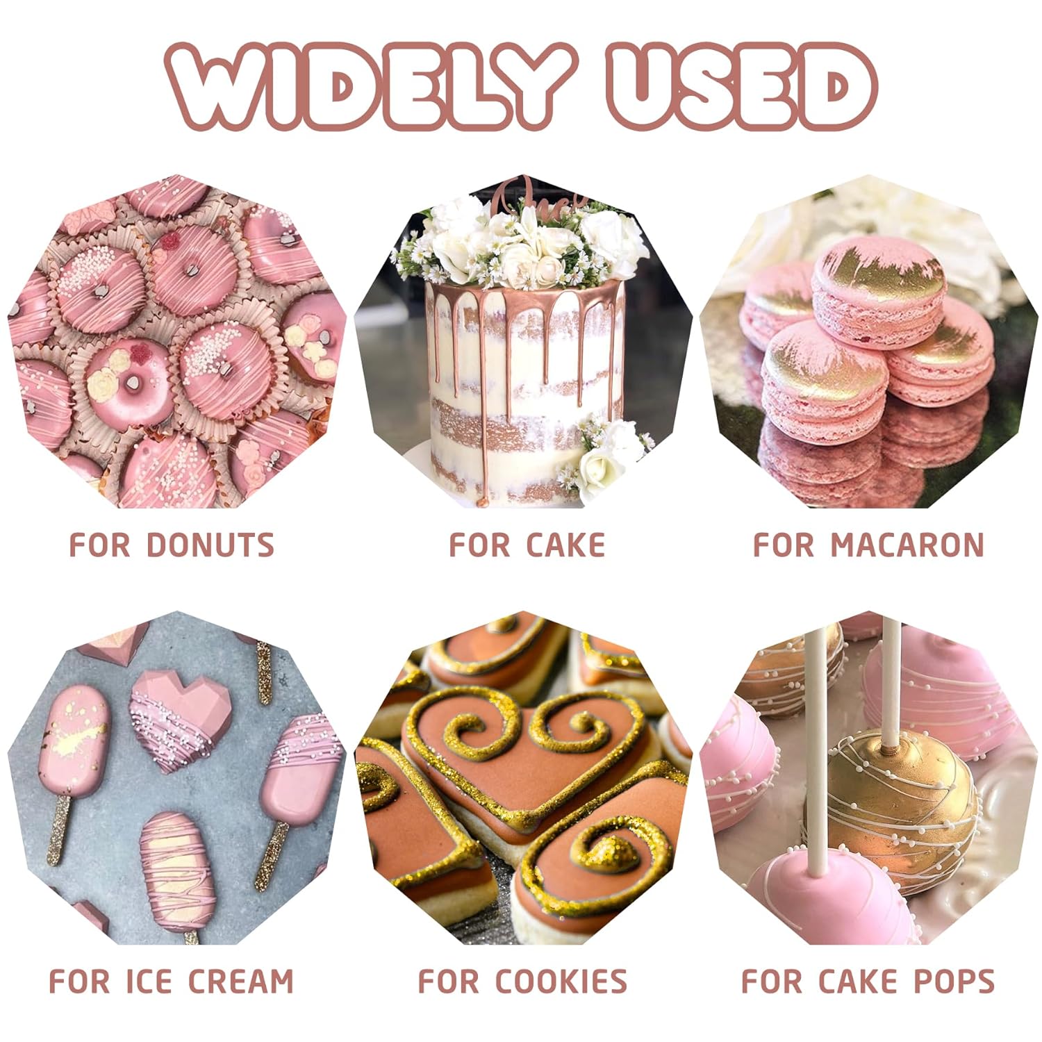 • METALLIC EDIBLE GLITTER PAINT - Specially crafted for food and baking decoration to get a metallic finish or add a gold-plated effect. All colors are brilliant and amazing. This fine texture edible cake paint can provide a high luster glitter effect to your cakes, chocolates, and candy!