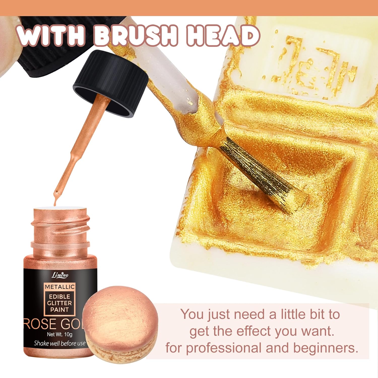 • METALLIC EDIBLE GLITTER PAINT - Specially crafted for food and baking decoration to get a metallic finish or add a gold-plated effect. All colors are brilliant and amazing. This fine texture edible cake paint can provide a high luster glitter effect to your cakes, chocolates, and candy!