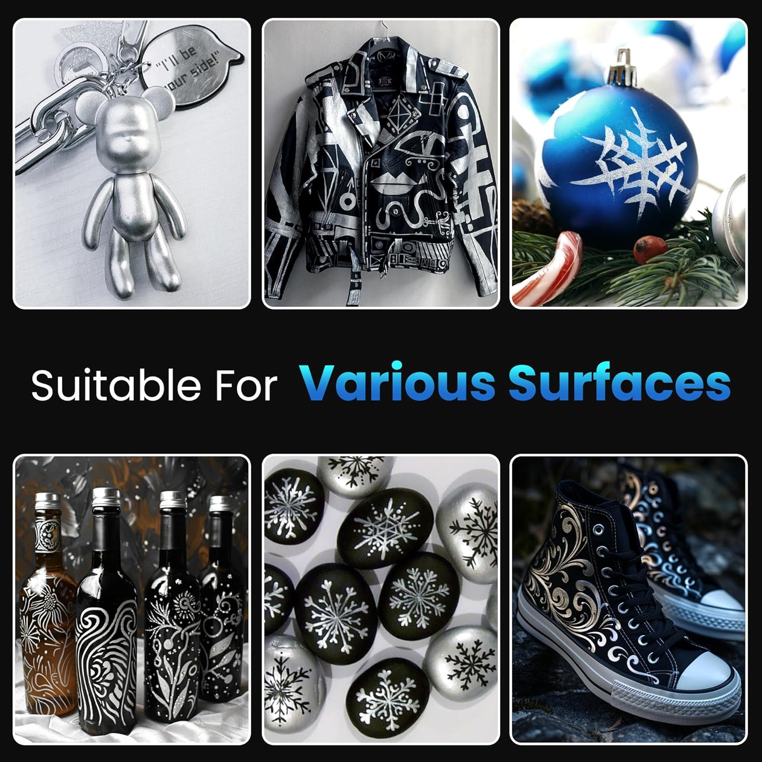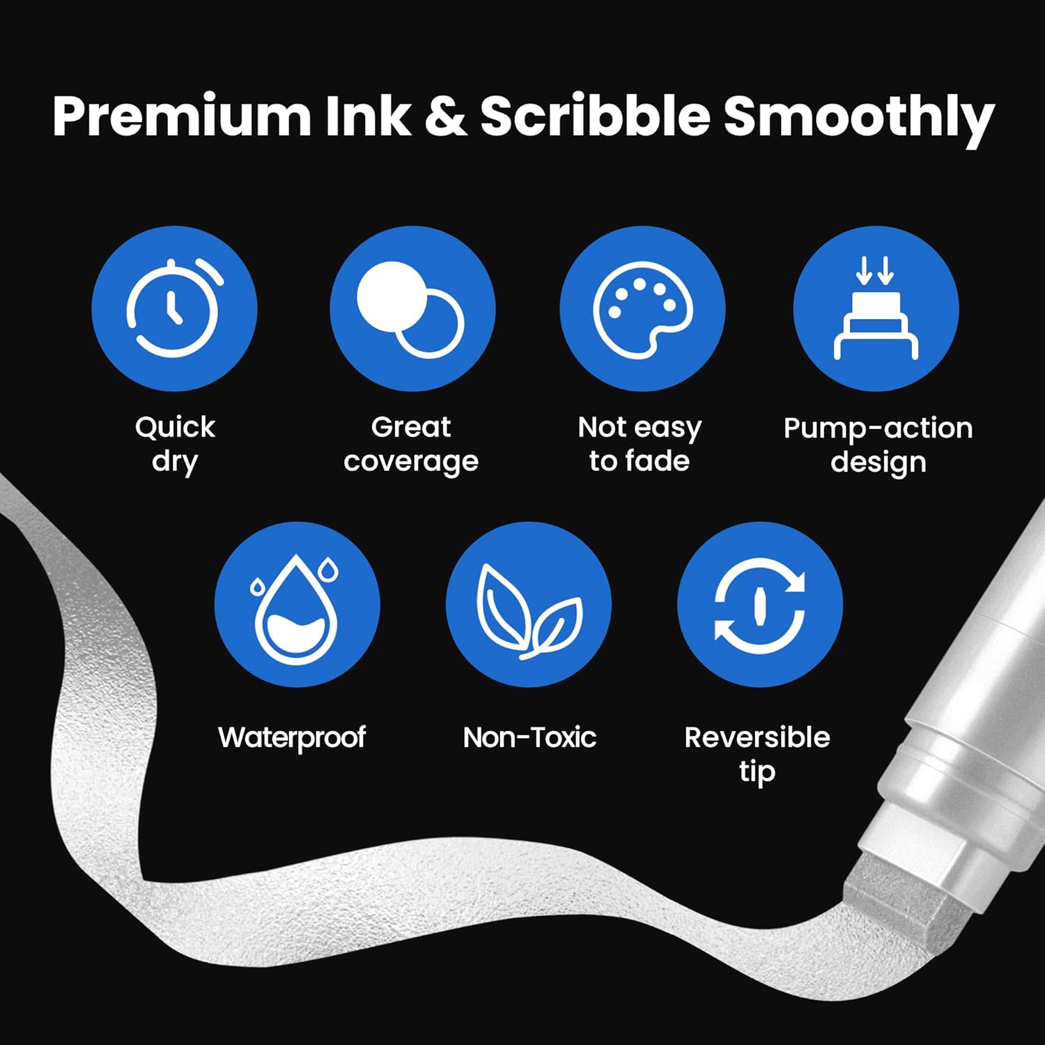 • Jumbo Permanent Markers silver Set: BIGTHUMB jumbo silver markers are made with the highest-quality non-toxic, acid-free, no odor, no-leakage water-based acrylic ink that is waterproof, quick dry, long-lasting, and smooth ink flow. Each fat permanent marker conforms to ASTM d-4236 and EN-71 safety standards