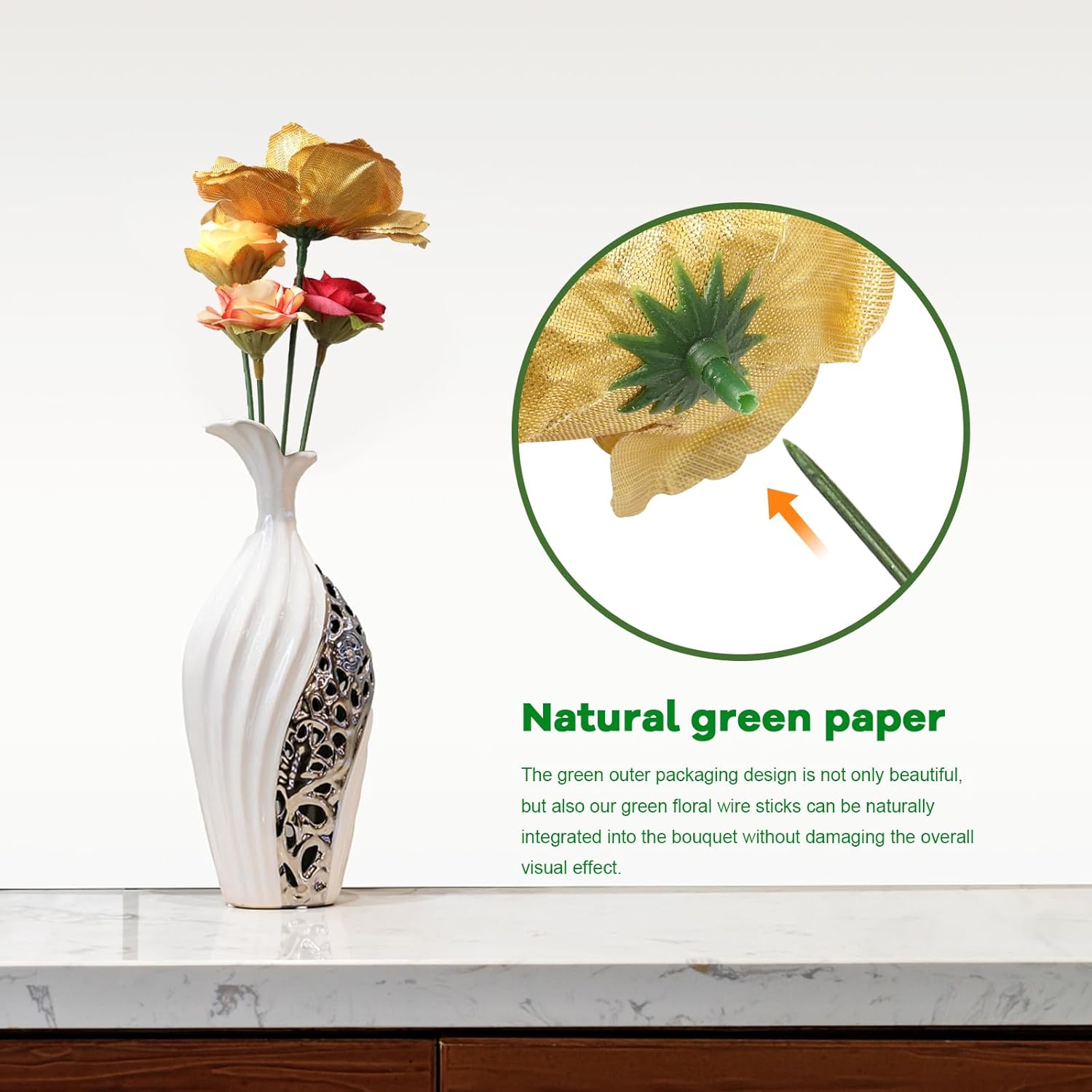 • Natural green paper: Green outer packaging design is not only beautiful, but also our green floral wire sticks can be naturally integrated into the bouquet without damaging the overall visual effect