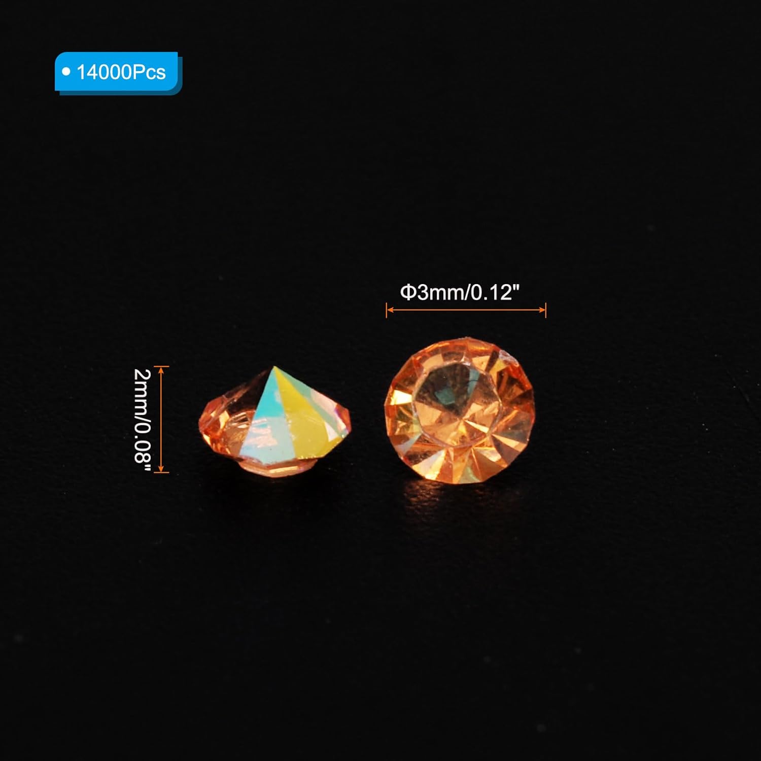 • Color: Orange AB; Material: Acrylic; Size: 3mm x 2mm/ 0.12 x 0.08 inch (Dia.x H); Packing List: 14000Pcs x Acrylic crystal diamonds