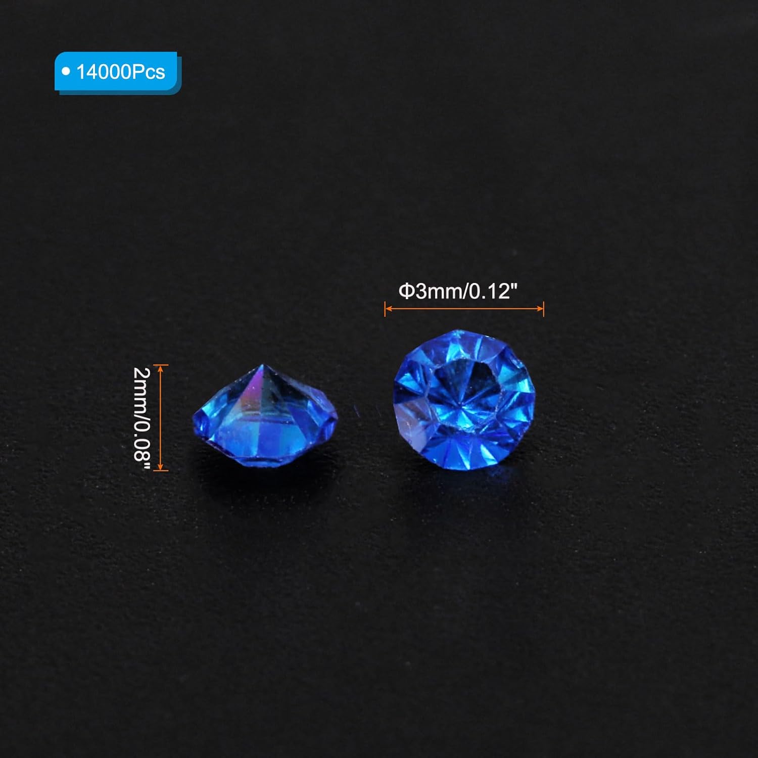 • Color: Dark Blue AB; Material: Acrylic; Size: 3mm x 2mm/ 0.12 x 0.08 inch (Dia.x H); Packing List: 14000Pcs x Acrylic crystal diamonds
